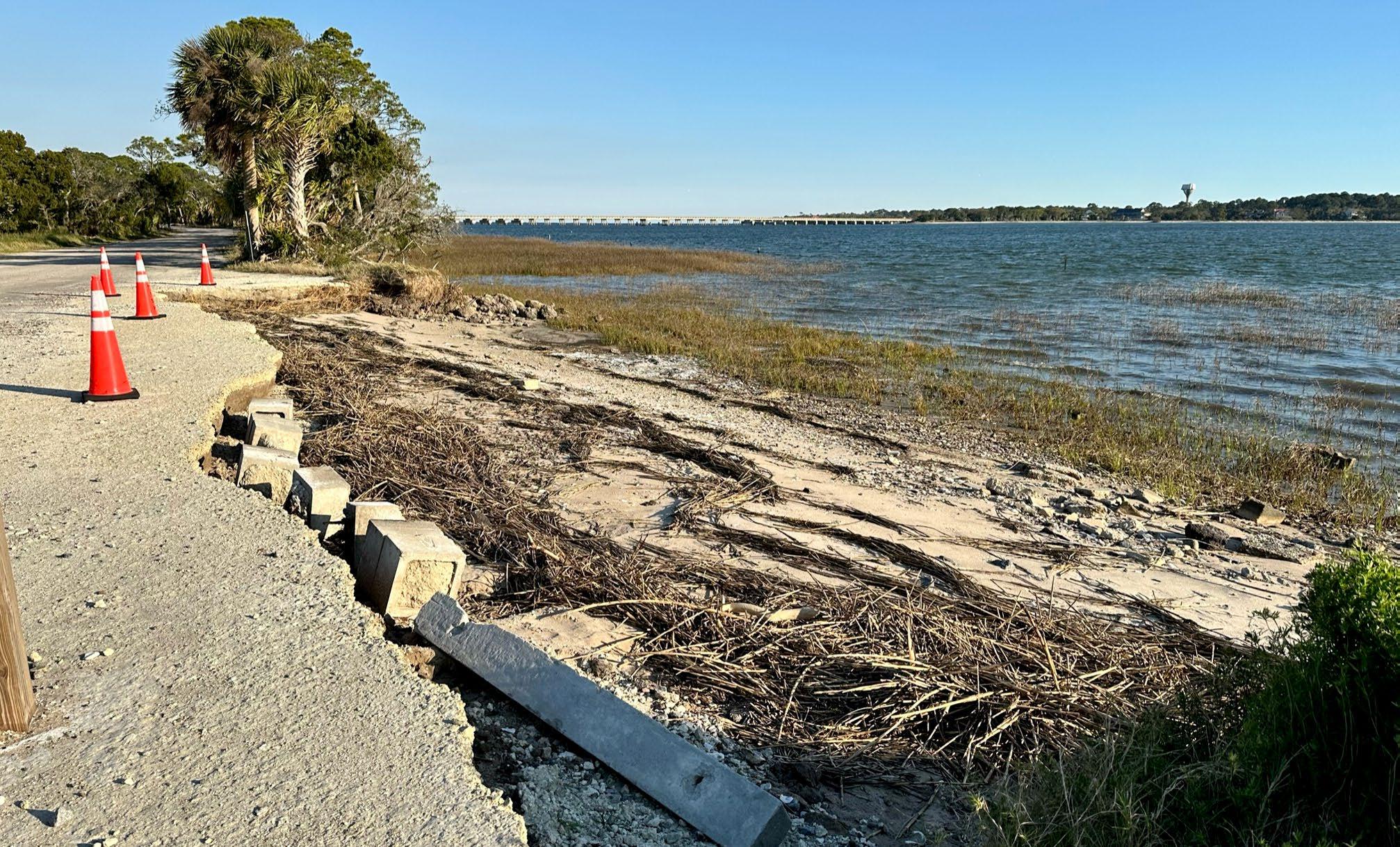 Erickson said that McCants showed her the critical line flag markers placed by S.C. Department of Health and Environmental Control’s (SCDHEC) office of Ocean and Coastal Resource Management (OCRM) and told her that they had only been given the option for an approved underlayment fabric and rip-rap to slow the erosion –which is not enough to stop the substrate from washing away the hard surface road, which if not mitigated, would lead to the bisection of the peninsula and cut off access to the boat landing from the road. She said that she is doing everything she can to work with the different agencies at play to save the public water access at Russ Point.