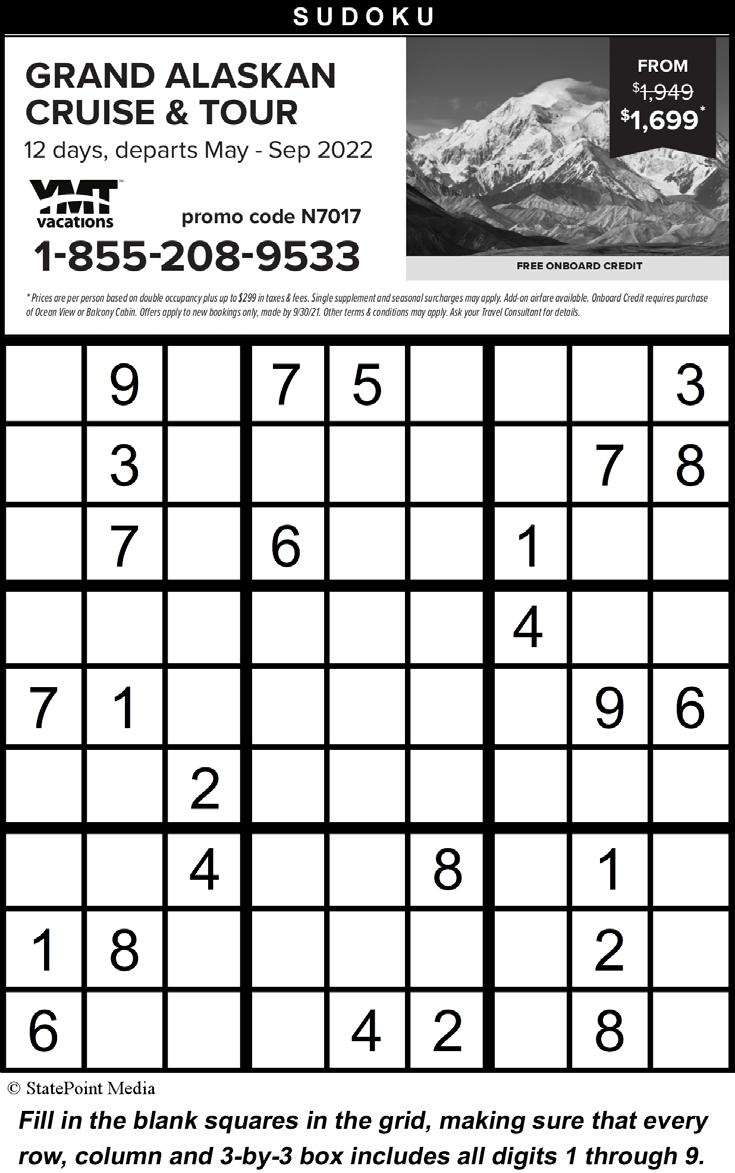 SEPTEMBER 15–21, 2022 A17 CLASSIFIEDS & GAMES THURSDAY’S CARTOON Read with caution; not necessarily the opinions of the editorial staff. THEME: OUTDOOR FUN 1.ACROSSRelating to Vatican's Francis 6. Denouement 9. HVAC tunnel 13. Lesser 52.50.48.47.46.44.43.41.40.39.37.35.30.28.25.24.23.21.19.18.17.16.15.14.destinationAntillesBigIslandnecklaceTruthwithoutproofLucianoPavarotti,e.g.DistressingacronymAcrylicfiber*Outinginawagon*Overnightingoutdoors"____TeChing"RCorJoltTaxproLowestbrassinstrument*AlfrescomealKaa'swarningThisandthatExtendedfamilymember"TheSunis____aStar"Namely(2words)"TheParentTrap"childRenter'spaperH.H.Munro'spseudonymSnakyswimmersGeisha'sgarbKids'constructionblockCausticchemical 53. Display displeasure 55. Blunder 57. *S'more cooker 61. *U-Pick destination 65. Yahoo! message 66. Hyperactivity acronym 68. Relating to hilum 69. To the point 70. Make a pigeon sound 71. Silly 72. Ancient eternal life 73.symbolHin British HMS 74. Socially inept 1.DOWN*Promenading route 2. Atlas stat 3. Small and weak 4. Cut short 5. Cowboy's catcher 6. Additional 7. Opposite of paleo 8. "Xanadu" music genre 9. Village, mostly in South 10.AfricaTangerine plus grapefruit 11. Colloquial "Follow me!" 12. NASA's orange drink 15. Master's area 20. Meryl Streep/Philip Seymour Hoffman 2008 22.movie*Climbing peak 24. Fashion week stage 25. *Sidewalk artist's medium 26. Mushroom caps 27. Indian black tea 29. Unwelcome reception, pl. 31. Give a quote 32. Handrail post 33. In an unfriendly manner 34. Incense without prefix 36. Comme ci, comme Áa 38. *Nature walk 42. Detroit mascot 45. Store as fodder 49. Not their 51. Lady Slipper, e.g. 54. "Lifestyles of the Rich and Famous" host 56. Horny odd-toed ungulate, for short 57. Between Phi and Kappa 58. Bad luck predictor 59. Police informer 60. *Angling reward 61. O in b.o. 62. Having wings 63. Military status 64. Squirrel's nest 67. Rudolph's Clarice, e.g. LAST WEEK'S CROSSWORD & SUDOKU SOLUTIONS