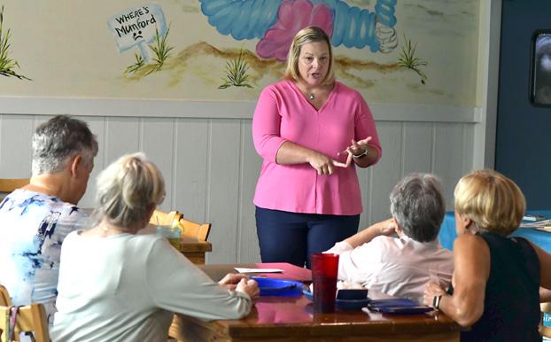 Lisa Ellis, a school teacher from Richland School District Two and Democratic candidate for S.C. School Superintendent with 22 years of teaching experience, tries to explain what it’s like to teach students while dealing with burdensome red tape and outdated rules. Ellis said that one way to improve South Carolina’s schools is to start electing a pro-school governor, state legislators and local school boards. Ellis addressed a small but enthusiastic crowd Saturday, Sept. 10, at Gilligan’s Restaurant. Bob Sofaly/The Island News