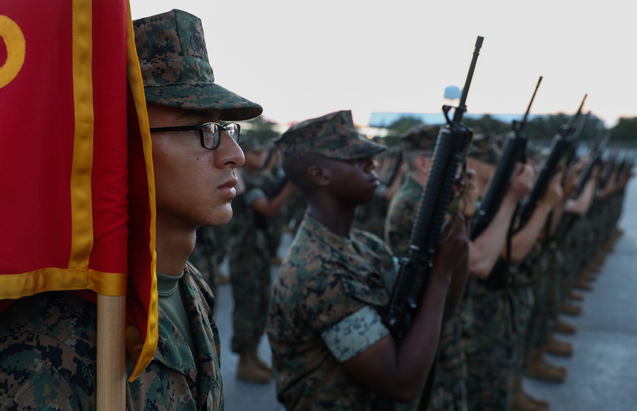 Recruits with Echo Company, 2nd Recruit Training Battalion, conduct Final Drill aboard Marine Corps Recruit Depot Parris Island, S.C., Sept. 13, 2023. Final Drill tests drill instructors on their ability to give drill commands and tests recruits on their ability to execute the movements properly. Lance Cpl. Bradley Williams/USMC