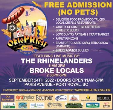 Hosted by the Town of Port Royal and the Old Village Association of Port Royal, the event goes down from 11 a.m. to 5 p.m., Saturday, Sept. 24, on Paris Avenue in Port Royal.The event will feature Ger man and American festival food with a variety of craft, imported, and domestic bev erages. There will also be live music, local vendors, a kidzone, classic cars and more. Admission is free. No pets allowed.There will be delicious food from food trucks, local chefs and restaurants, as well as a variety of craft, import ed and domestic beers and a Lowcountry artisan and craft market. Not to mention a family fun zone, a classic car and truck show from11 a.m. to 2 p.m., and Bikers Against Bullies.There will be live music by the Rhinelanders (11 a.m. to 2 p.m.) and Broke Locals (2:30 to 5 p.m.). For more information, visit www.portroyalova.com