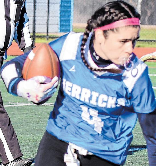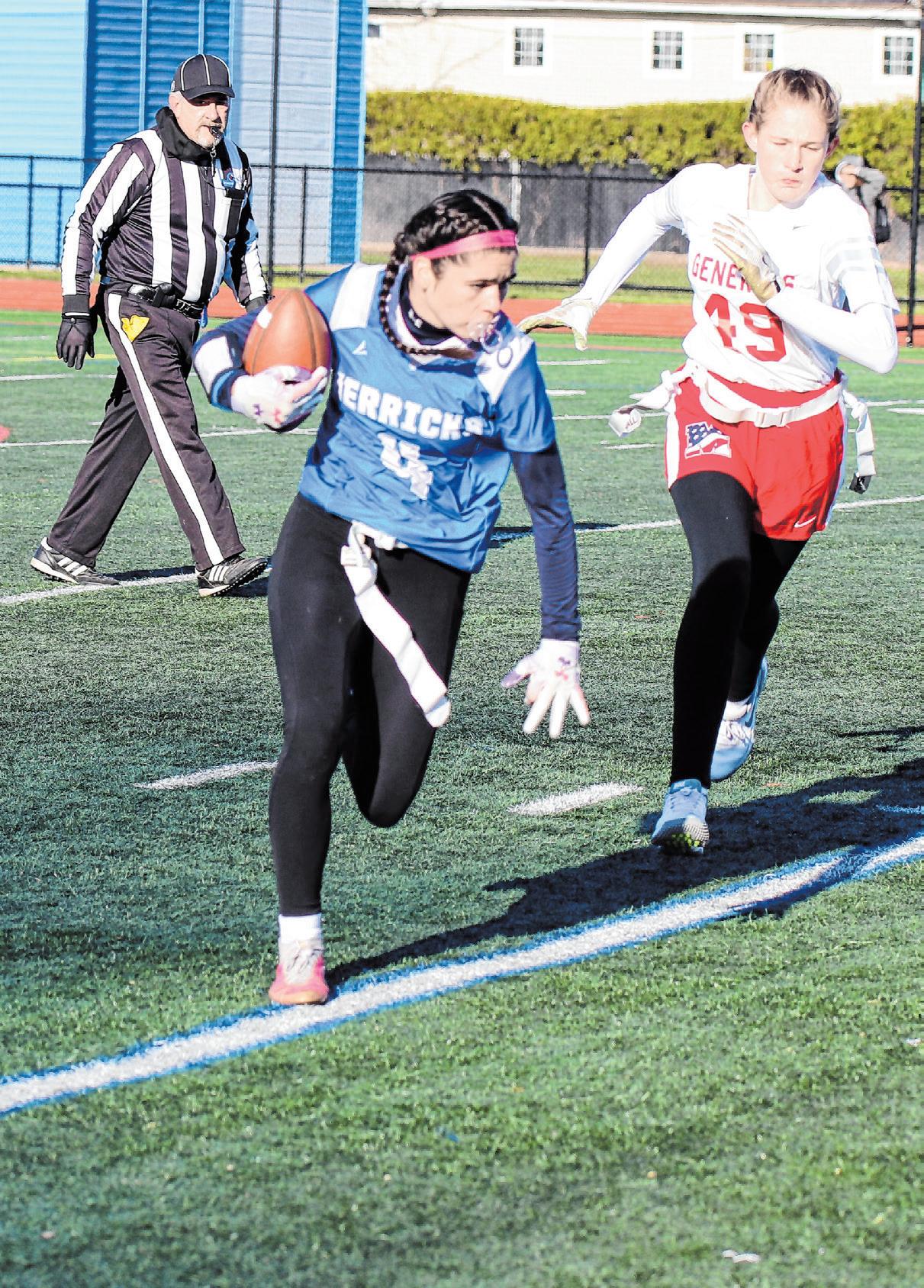 The Herricks High School senior was happily recounting life as a new flag football player, and some of the bumps and bruises she’s gotten so far.