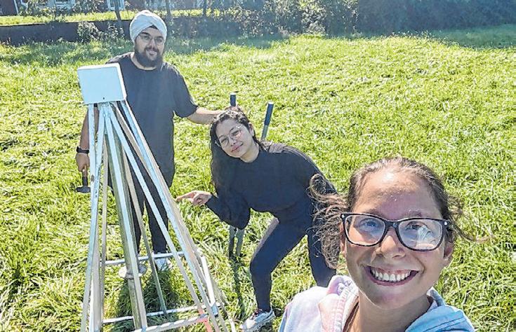 LEAP-UP students Eishan Singh, rear, and Gabriella Anzalone, front, work alongside fellow student Amy Lopez Calderon at the campus’ four-sided dipole radio antenna, a radio astronomy device located at SUNY Old Westbury and used by the campus’ faculty and student researchers.