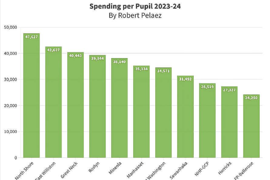 The range of spending per pupil in the 11 public school districts in the North Shore ranges from more than $47,000 to less than $24,000, according to the analysis.