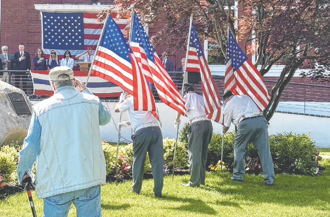 Veteran Rick Wright salutes the flags as they are raised on the lawn of village hall during New Hyde Park’s Memorial Day ceremony.