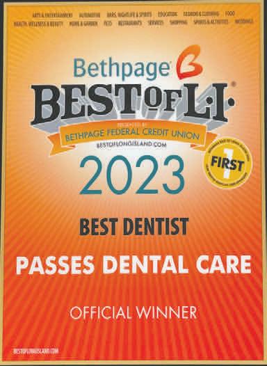 51 The Port Washington Times, Friday, May 12, 2023 PW Passes Dental Care 415 Northern Blvd., Great Neck, NY 11021 www.passesdentalcare.com We are conveniently located just west of Middle Neck/Lakeville Rd. CALL TODAY...(877) 678-3418 We Accept All Major Credit Cards • Interest Free Payment Plans Available • Convenient On-Site Parking Like Us on Facebook at facebook.com/passesdentalcare SLEEP THE NIGHT. SEIZE THE DAY. Conquer sleep apnea, snoring and fatique with a comfortable oral appliance covered by most medical insurance. Voted Best Cosmetic & Best General Dentist Eight Years in A Row Vote for us for Best of 2023 WE BELIEVE. . . IN ADVOCATING FOR OUR PATIENTS’ DENTAL HEALTH IN A WARM, FRIENDLY ENVIRONMENT THROUGH LISTENING, CARING AND EXPLAINING. SIMPLE AND EASY Privately owned with personalized and caring service. PRESENTED BY BLANK SLATE MEDIA WINNER 8th Consecutive Year Best Nassau County OF 2022 +
