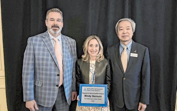 Port Washington Water District Commissioner Mindy Germain, center, was recently honored with the New York Section of the American Water Works Association’s Recognition for Service to the Water Profession Award by NYSAWWA Chairman Jamie Howard, left, and AWWA Immediate Past-President Chi Ho Sham.