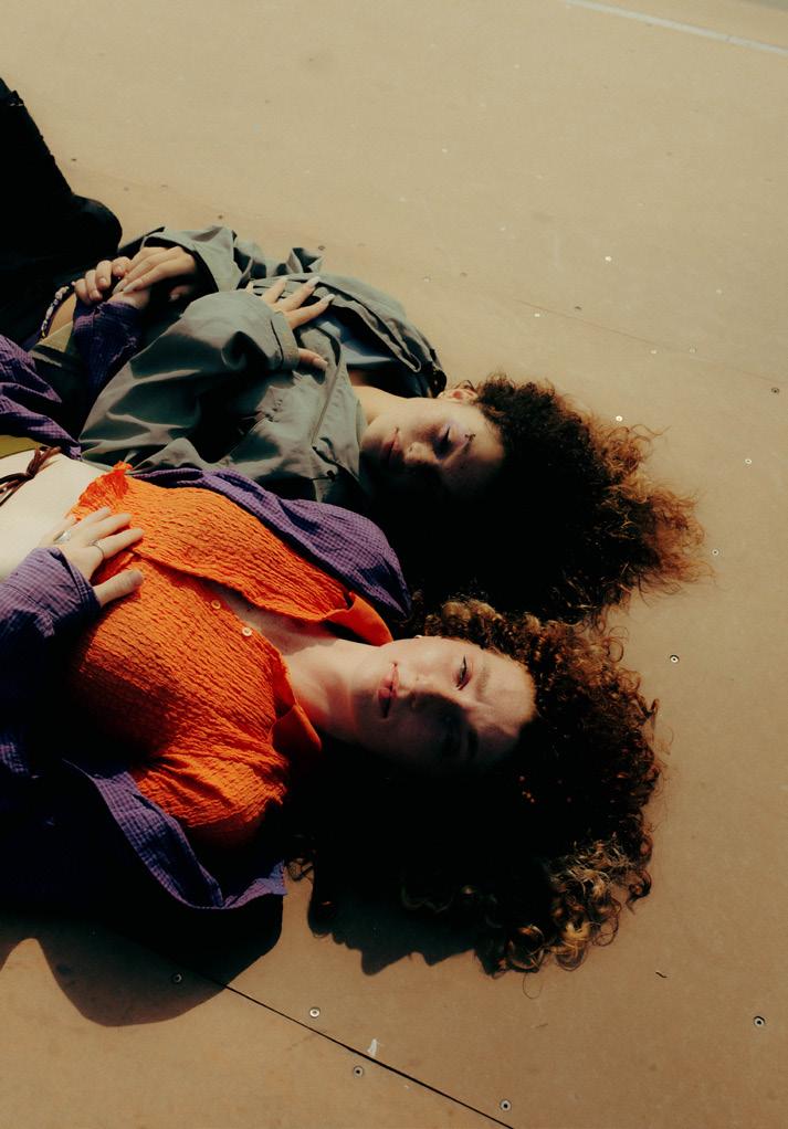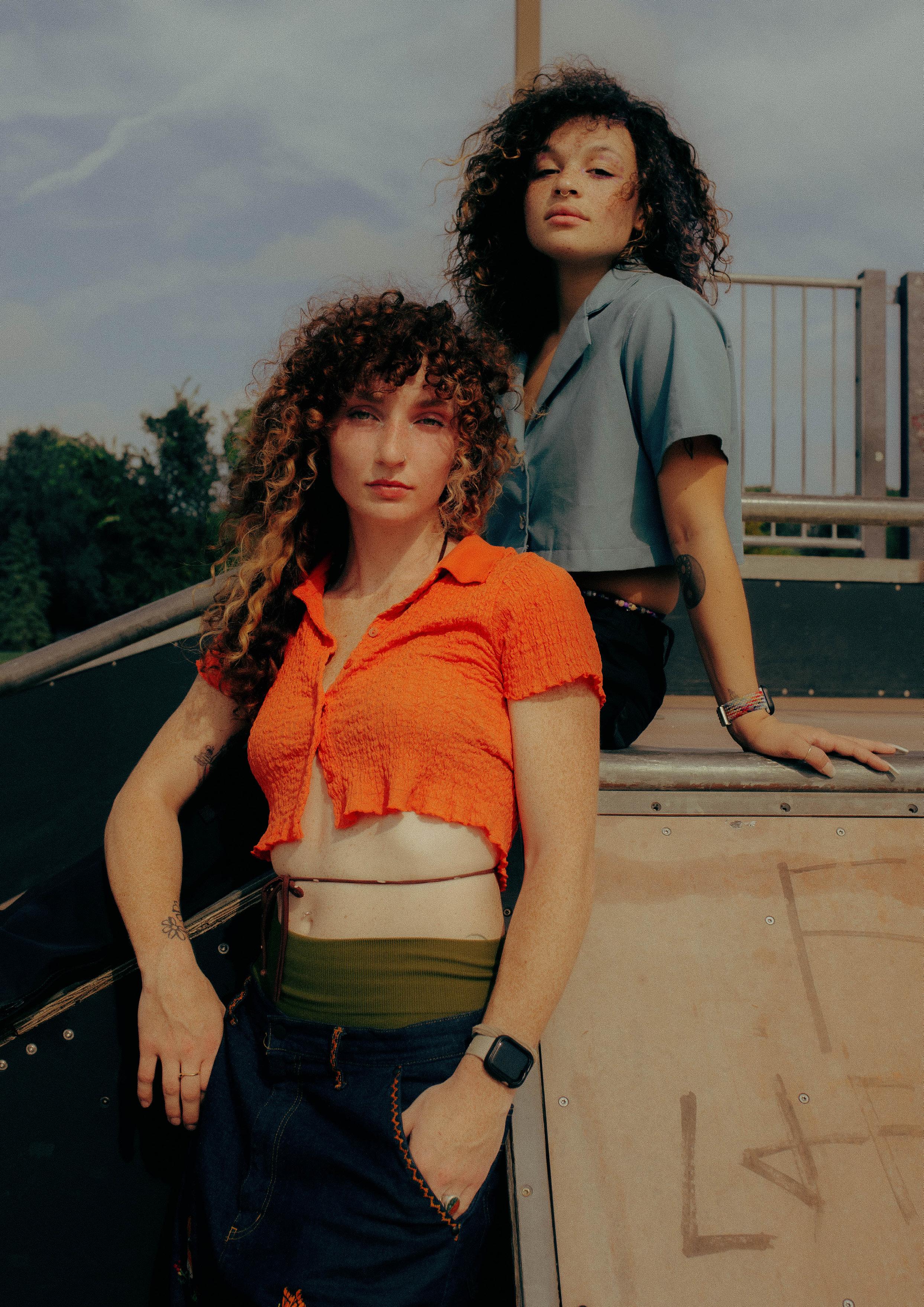 Chani is styled in a UO puckered orange button up crop top and darkwash embroidered jeans by Needles. Jada is wearing a cropped Linen shirt by Lisa Lor (@lisaa_baabyy) with thrifted cargo pants.
