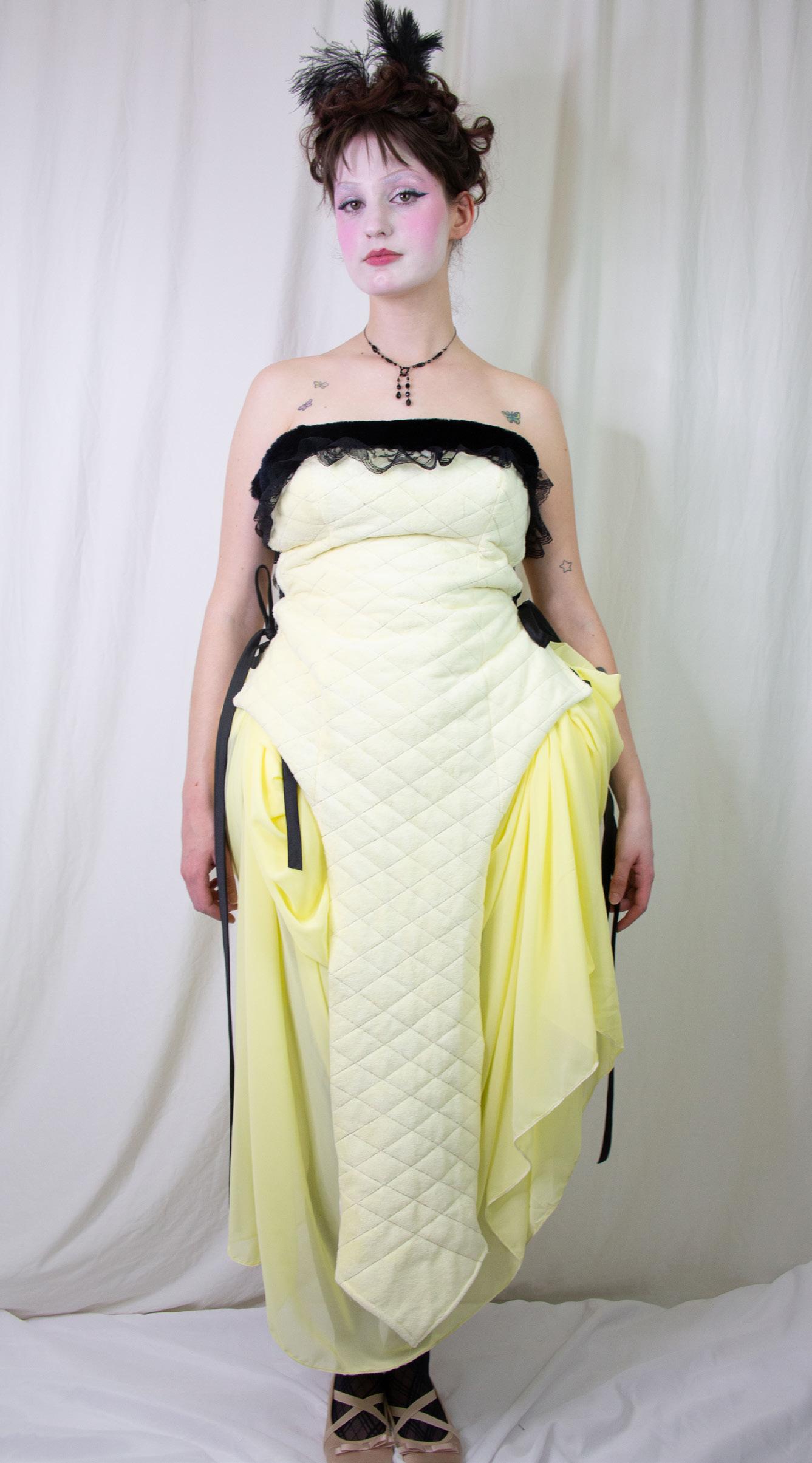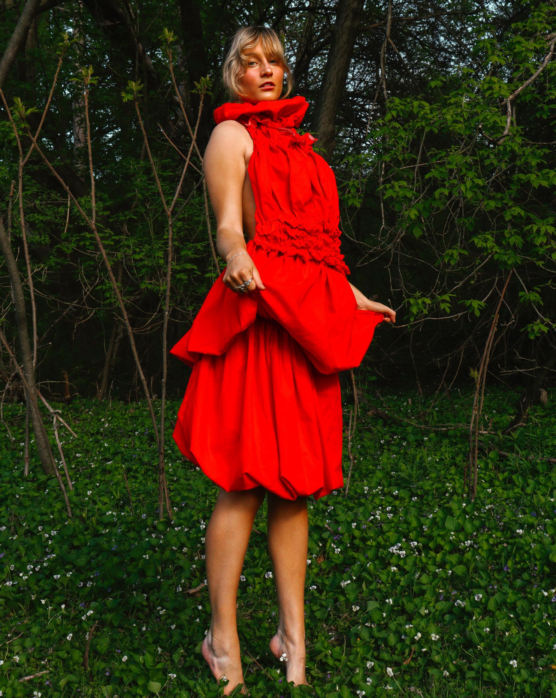 I’m a senior currently pursuing a Textile and Fashion Design major after transferring from the Arts department. I’m from La Crosse, WI and have been so charmed by Madison. I have always loved creating and am very grateful to be able to spend my time doing so. She’s getting married! Her party will be lavish and lovely and empty of expectations. This collection evokes a feeling of play and lust; adoration for the hidden. An invitation to dance encumbered by the weight of fabric and regulation. The stripped down opulence provokes those who regard modesty as a virtue rather than an option.