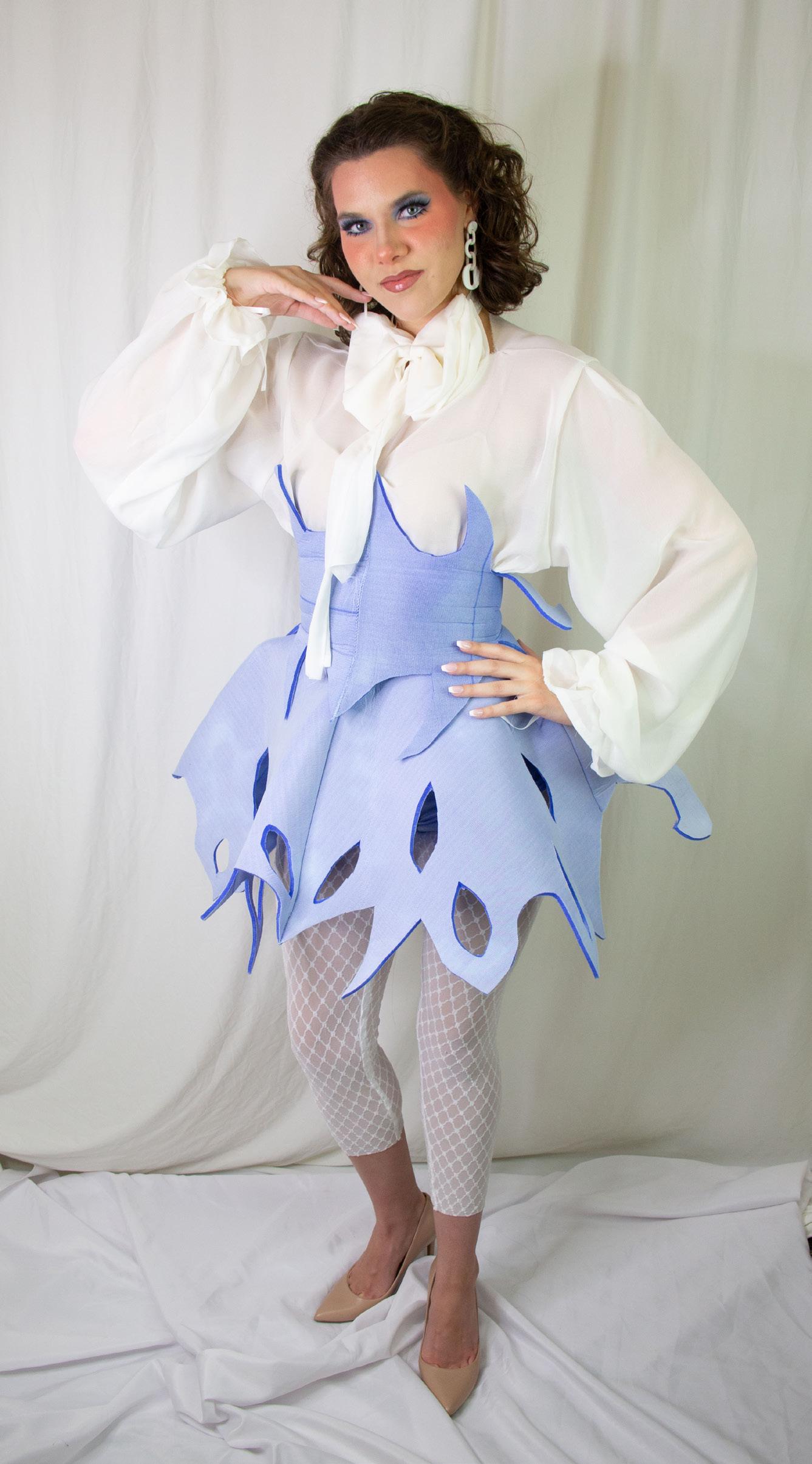A current sophomore at UW Madison studying Fashion and Textiles Design as well as Sustainability. Lily Rogers grew up in Cedarburg, Wisconsin with a passion for handcrafting and the outdoors. Coming from an artistic family of six, she has always been driven by the idea of community, the environment, and utilizing the resources that she has at her disposal. The Vulcan, inspired by the architectural composure of UW Madison’s Observatory Building, challenges the juxtaposition of structure and fluidity. By marrying elements of the buildings’ history and form, each piece carries a relevance to the buildings’ backstory.