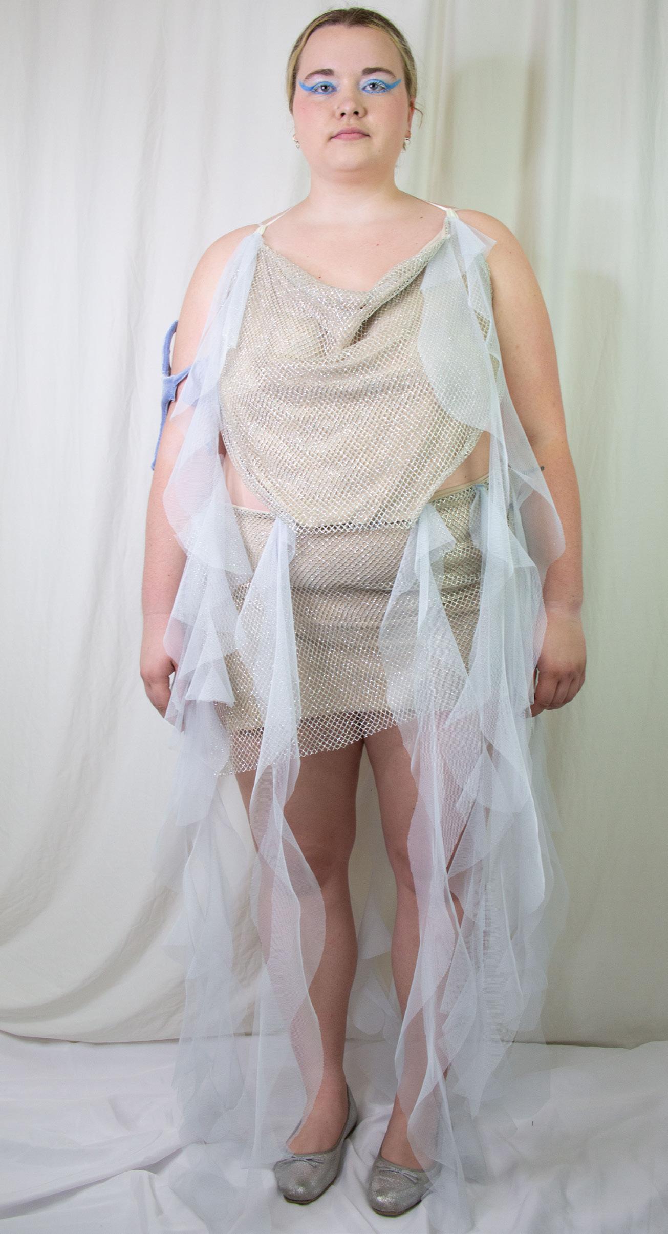 I’m a sophomore pursuing a Textile and Fashion Design major and Mathematics certificate. I am from Middleton, WI and proudly rep Madison as my home! With a background in fiber arts and freelance commissions, I am most excited by textures and volume. Indecent. A loud, flamboyant, unflinching collection celebrating the queer identity in all its forms. A thank you to the 14 year old admins running gay Instagram accounts when I was in middle school. A love letter to my friends. A warm hug for myself. “Indecent” is a four look collection juxtaposing innocence and repressed creativity with self-expression and exploration.