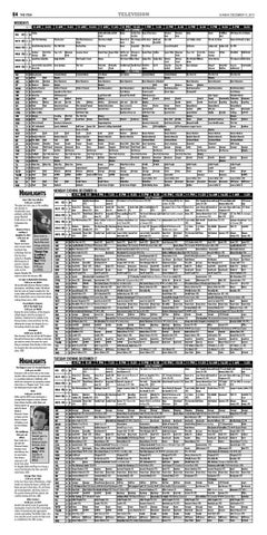 CABLE CHANNELS The First 48 (HD) Duck (HD) Duck (HD) Duck (HD) Duck (HD) Duck (HD) Duck (HD) Duck Dynasty (HD) (:01) Rodeo Girls (HD) Duck (HD) Duck (HD) Duck (HD) Duck (HD) Legally Blonde (‘01) Reese Witherspoon. (HD) Home Alone (‘90, Comedy) aaa Macaulay Culkin. (HD) Home Alone (‘90, Comedy) aaa Macaulay Culkin. (HD) Legally Blonde (HD) River Monsters (HD) Alien Autopsy (HD) Body Found Extended Additional footage. New Evidence - Exteneded (N) New Evidence - Exteneded Mermaids Extend 106 & Park (N) (HD) Husbands The Wash (‘01, Comedy) a Dr. Dre. Belly 2: Millionaire Boyz Club (‘08) The Game. Wendy Williams (HD) Above the Rim (‘94) Housewives Housewives Real Housewives (N) Vanderpump Rule (N) Housewives Settle. Watch What Housewives Settle. Vanderpump Housewives Mad Money (N) Kudlow Report (N) 60 Minutes Greed Financial fraud. Car Chaser Car Chaser Mad Money 60 Minutes Car Chaser Car Chaser Situation Crossfire Erin Burnett (N) Cooper 360° (N) (HD) Piers Morgan LIVE (N) Anderson Cooper The 11th In Case Piers Morgan (HD) Cooper 360° (HD) South Prk Tosh (HD) Colbert Daily (HD) Futurama Futurama Futurama South Prk South Prk South Prk Daily (N) Colbert South Prk South Prk Daily (HD) Colbert Good Luck Jessie Good Luck Jessie Jessie Good Luck Phineas Fish Hooks Jessie A.N.T. Good Luck Jessie Good Luck Good Luck Shake It A.N.T. Fast N’ Loud (HD) Fast N’ Loud (HD) Fast N’ Loud (HD) Fast N’ Loud (HD) Street Outlaws (N) Fast N’ Loud (HD) Fast N’ Loud (HD) Street Outlaws (HD) Sports Monday Night Countdown (HD) (:25) Monday Football: Baltimore Ravens at Detroit Lions z{| (HD) SportsCenter (HD) NFL Primetime (HD) Horn (HD) Interruptn SportsCenter (HD) 30 for 30: Youngstown Boys (HD) 30 for 30 30 for 30 Sports Olbermann (HD) NBA (HD) SportsCenter (HD) Middle Middle The Santa Clause (‘94, Holiday) Tim Allen. (HD) The Santa Clause 2 (‘02) aac Tim Allen. (HD) The Santa Clause 3: The Escape Clause (HD) Prep (HD) Prep (HD) Diners Diners Diners, Drive-Ins (HD) Guy’s Grilled cheese. Diners, Drive-Ins (HD) Diners (N) Diners Diners, Drive-Ins (N) Diners, Drive-Ins (HD) Diners Diners Special Report (HD) On the Record (N) O’Reilly Factor (N) The Kelly File Hannity (HD) O’Reilly Factor (HD) The Kelly File Hannity (HD) World Poker (HD) UFC Unleashed (HD) Golden Boy Live no} (HD) World Poker (HD) World Poker (HD) Golden Boy Live no} (HD) Help for the Holidays (‘12) Summer Glau. (HD) Window Wonderland (‘13) Naomi Judd. (HD) Farewell Mr. Kringle (‘10) Christine Taylor. (HD) Karroll’s Christmas (‘04) Christmas hijinks. (HD) Income Property (HD) Love It or List It (HD) Love It or List It (HD) Love It or List It (N) Now? (N) Hunters Love It (N) Love It or List It (HD) Now? Hunters The Bible: Mission; Betrayal Miracles; betrayal. Pawn Stars Pawn Stars Pawn Stars Pawn Stars The Bible Pawn Stars Pawn Stars Pawn Stars Pawn Stars Pawn Stars Pawn Stars Pawn Stars Criminal Minds (HD) Criminal Minds (HD) Criminal Minds (HD) Criminal Minds (HD) Criminal Minds (HD) Criminal Minds (HD) Criminal Minds (HD) Without a Trace (HD) An Accidental Christmas (‘07) ac (HD) Dear Secret Santa (‘13) Tatyana Ali. (HD) A Diva’s Christmas Carol (‘00) aac (HD) (:02) Dear Secret Santa (‘13) Tatyana Ali. (HD) Sponge Sponge Sam & Cat Awesome Full Hse Full Hse Full Hse Full Hse Full Hse Full Hse Friends Friends Friends (:48) Friends Lopez (4:30) Deja Vu (‘06) aaa (HD) Man on Fire (‘04, Drama) Denzel Washington. Bodyguard’s revenge. (HD) GT Academy (HD) The Guardian (‘06, Action) Kevin Costner. Swim teacher. (HD) 28 Days Later (‘02) The Bleeding (‘09, Action) ac Vinnie Jones. Black Christmas (‘06, Horror) ac Katie Cassidy. Cirque du Freak: Vampire’s Assistant (HD) Dracula 2000 (‘00) ac Seinfeld Seinfeld Seinfeld Family Family Family Family Big Bang Big Bang Big Bang Conan (N) (HD) Office Conan (HD) Office Attorney (‘32) (:15) Playhouse O’Henry’s Full House (‘52) aac Fred Allen. Meet John Doe (‘41, Drama) aaa Gary Cooper. (:15) Good Sam (‘48, Romance) aa Gary Cooper. Toddlers (HD) Funeral Funeral Bakery Boss (N) (HD) Bakery Boss (N) (HD) Funeral Funeral Bakery Boss (HD) Funeral Funeral Bakery Boss (HD) Castle (HD) Castle (HD) Major Crimes (HD) Major Crimes (N) (HD) Rizzoli & Isles (HD) Major Crimes (HD) Cold Justice (HD) Hawaii Five-0 (HD) Lizard Lic Lizard Lic Lizard Lic Lizard Lic Lizard Lic Lizard Lic Lizard Lic Lizard Lic Full Throttle (N) Lizard Lic Lizard Lic Lizard Lic Lizard Lic Lizard Lic Lizard Lic Griffith Griffith Griffith Griffith Griffith Loves Raymond (HD) Raymond Raymond Raymond Raymond Queens Queens King of Queens (HD) Queens NCIS: Road Kill (HD) NCIS: Caged (HD) WWE Monday Night Raw (HD) (:05) White Collar (HD) (:09) NCIS: L. A. (HD) (:07) NCIS: L. A. (HD) Will Grace Will Grace Will Grace Will Grace CSI: Miami (HD) CSI: Miami: 10-7 (HD) CSI: Miami (HD) CSI: Miami (HD) CSI: Miami: Prey (HD) CSI: Miami (HD) Home Videos (HD) Home Videos (HD) Home Videos (HD) Home Videos (HD) Home Videos (HD) How I Met Rules Rules Parks Parks 30 Rock