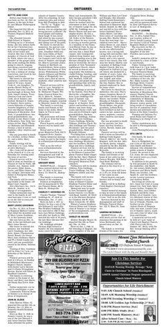 FRIDAY, DECEMBER 19, 2014 William and Rosa Lee Chestnut Murphy. She attended Rafting Creek Elementary School and continued her education at Ebenezer High School, Dalzell. In 1968, she met and fell in love with her future husband, Harry James Moore, and after three years of courtship she became Mrs. Shirley Moore. From this marriage, two children were born – Harry James Moore Jr. and Albert Derek Moore. “Daffy Duck,” as she was affectionately known, was a loving and caring wife and mother, dedicated to the care of her family, and a very special aunt to her nieces, who will miss her dearly. Shirley was a member of Rafting Creek Baptist Church. She was employed by DuPont in Logoff, where she worked for a number of years. Later, she was employed by Holiday Inn, Lugoff, and subsequently transferred to Holiday Inn, Sumter. She remained employed by them for many years. She leaves to cherish her memories: two sons, Harry James (Jasmine) Moore Jr. and Albert Derek (Antuane) Moore; one brother, Willie Murphy of Pahokee; one granddaughter, Shanquita Nicole Moore; one greatgrandson, LeSean Kelly; three brothers-in-law; four sisters-in-law; numerous nieces, nephews, cousins, other relatives and many friends. She was preceded in death by her parents; her husband; and four brothers, Calvin, Harold, James and Richard. Funeral services will be held at noon on Saturday at Rafting Creek Baptist Church, 3860 S.C. 261 North, Rembert, with the Rev. Melvin Mack, pastor, eulogist, assisted by the Rev. Burdell Hill and Minister Lillian Reynolds. The family is receiving family and friends at the home of her sister-in-law, Geneva Murphy, 5205 Betty Jean Road, Rembert. The remains will be placed in the church at 11 a.m. The procession will leave at 11:30 a.m. from the home of her sister-in-law. Floral bearers and pallbearers will be family and friends. Burial will be in Rafting Creek Baptist Churchyard cemetery. Online memorial messages may be sent to the family at williamsfuneralhome@sc. rr.com. Visit us on the web. Services directed by the management and staff of Williams Funeral Home Inc., 821 N. Main St., Sumter.