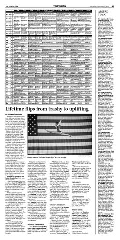 Lifetime flips from trashy to uplifting BY KEVIN MCDONOUGH Networks are never consistent. Lifetime is acting like a guilt-ridden, wayward parent who let us get away with too much fun and now insists that we eat our vegetables. Having attracted large audiences with purposefully trashy, over-thetop guilty pleasures like “Flowers in the Attic” and “Lizzie Borden Took an Ax,” the network presents “The Gabby Douglas Story” (8 p.m. Saturday, TV-G), a film that celebrates talent, persistence, fortitude and pluck. It screams “uplifting and noble.” Sydney Mikayla stars as the gymnast as a child, while Imani Hakim plays her as a young teen. Regina King (“Southland”) plays Gabby’s inspiring mother, and S. Epatha Merkerson (“Law & Order”) portrays her grandmother, who offers a roof over their heads when Gabby’s family falls apart. With its emphasis on a surprising success story, “Gabby” is not unlike those hard-luck profiles that run during the Olympics or the audition round of “American Idol.” But this movie is two hours long. And you already know how it ends. “Beyond the Headlines: The Gabby Douglas Story” (10 p.m., TV-G) follows. • Don’t accuse me of not caring about Super Bowl XLVIII (6:30 p.m., Fox). I mean, how can you not get excited about a TV spectacle where a Doritos commercial is considered a high point? Having grown up just a (slightly ambitious) seven-mile Schwinn bike ride from the site of the game, I guess I have some kind of local pride for that special section of New Jersey, that landfill of opportunity. I hope the big Super Bowl blimp’s camera offers a glimpse of Rutt’s Hut, a hot dog restaurant located in nearby Clifton. It serves a special breed of frankfurter there. The short order cook boils — or rather, scalds — it in hot oil until it bursts open. The hot dog isn’t called “the ripper” for nothing! I’m also hoping the blimp cam casts a glance over at American Dream Meadowlands. Only a mile from the stadium, it’s an empty retail and entertainment complex that used to be called Meadowlands Xanadu.