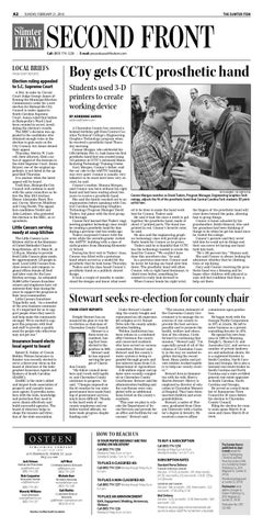 Boy gets CCTC prosthetic hand Students used 3-D printers to create working device BY ADRIENNE SARVIS adrienne@theitem.com A Clarendon County boy received a belated birthday gift from Central Carolina Technical College’s Engineering Graphics Technology program when he received a prosthetic hand Thursday morning. Connor Morgan, who celebrated his 13th birthday Feb. 11, took home his first prosthetic hand that was created using 3-D printers at CCTC’s Advanced Manufacturing Technology Training Center. Gary Morgan, Connor’s father, said the car ride to the AMTTC building was very quiet. Connor is usually very talkative so he must have been very excited, he said. Connor’s mother, Shanna Morgan, said Connor was born without his right hand and had been waiting about two years to receive a prosthetic hand. She said the family reached out to an organization before speaking with Central Carolina Engineering Graphics Technology Program Manager David Tuders, but plans with the first group fell through. Connor first learned that Tuders’ engineering graphics technology class would be creating a prosthetic hand for him during a previous visit two weeks ago. Tuders surprised Connor with the news while the seventh-grader visited the AMTTC building with a class of sixth-graders from Manning Elementary School. During his first visit to Tuders’ class, Connor was fitted with a prototype hand which served as a model for the prosthetic that he took home Thursday. Tuders and his class based Connor’s prosthetic hand on a publicly shared design. It took a couple of months to understand the designs and know what need-