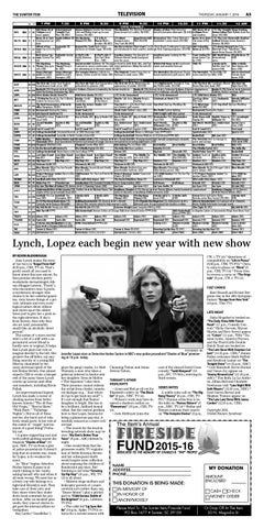 The First 48: Night Run Young father The First 48: M.I.A. Mysterious dis- (:01) Nightwatch: Triumph & Trag- (:02) The First 48: Teardrops; Almost The First 48: found dead in trunk of car. (HD) ambushed by gunmen. (HD) appearance of welder. (N) (HD) edy Pulled under. (N) (HD) Home Man shot dead. (HD) Night Run (HD) Rocky IV (‘85, Drama) aac Sylvester Stallone. A former champion co- Rocky V (‘90, Drama) aa Sylvester 180 Rocky III (‘82, Drama) aaa Sylvester Stallone. A boxer is trained by his former rival to reclaim the boxing championship. (HD) mes out of retirement to challenge a deadly Russian boxer. (HD) Stallone. Rocky’s protégé. (HD) 100 West Alaska Grizzly Sized (N) Wild West Alaska (N) (HD) (:02) To Be Announced (:02) To Be Announced (:02) Wild West Alaska (HD) TBA Martin: Jerome’s Martin Talk show Martin Beauty Criminals at Work (HD) Zoe Ever After: (:31) Husbands Wendy Williams 162 (:20) Martin: Break Up, Part 3 Martin Martin: Credit realizes he misses Gina. Card Blues in the House topic. mishap. Pilot (HD) (HD) Show (N) The Real House wives of Beverly In side the Ac tors Stu dio: Jeff Top Chef: It’s a Dry Heat Chefs cook Top Chef: Big Gay Wed ding (N) (:15) What Hap (:45) Top Chef: Big Gay Wedding 181 Hills: Hamptons, 90210 Daniels (N) on a famous golf-course. pens (N) (HD) 62 Restaurant: Raising the Stakes Shark Tank (HD) Shark Tank Children’s idea. (HD) The Profit Custom lighting. Restaurant: Raising the Stakes Restaurant 64 Erin Burnett OutFront (N) To Be Announced To Be Announced CNN Tonight with Don Lemon To Be Announced TBA Key & Peele (HD) Key & Peele (HD) Key & Peele: MC Key & Peele (HD) Workaholics Old Workaholics Daily Show with Nightly Show w/ (:01) @midnight 136 Tosh.0 Pre-show Tosh.0 (HD) ritual. (HD) Mom (HD) rival. (HD) (HD) Trevor (N) Wilmore (N) (N) (HD) Liv and Maddie Austin & Ally K.C. Undercover K.C. Undercover Best Friends Austin & Ally Girl Meets World K.C. Undercover Jessie Dance 80 Liv and Maddie Austin & Ally (HD) (HD) (HD) (HD) (HD) (HD) Whenever (HD) (HD) (HD) (HD) class. (HD) 103 Fast N’ Loud (HD) Fast N’ Loud (HD) Fast N’ Loud Dart dragster. (HD) Diesel Brothers (HD) Fast N’ Loud (HD) Fast Loud 35 College Basketball: Cincinnati Bearcats at SMU Mustangs (HD) College Basketball: Illinois vs Michigan State z{| (HD) SportsCenter (HD) Sports (HD) 39 College Basketball: Louisville vs North Carolina State (HD) College Basketball: Arizona Wildcats at UCLA Bruins z{| (HD) Basketball NFL Live (HD) Harry Potter and the Goblet of Fire (‘05, Fantasy) aaac Daniel Radcliffe. A young wizard finds himself competing in a hazard- The 700 Club How to manage inThe Flintstones 131 Willy Wonka Chocolate (HD) ous tournament between rival schools of magic, but he is distracted by recurring nightmares. (HD) come and savings. (‘94) aa (HD) 109 Chopped: Wild Ride (HD) Chopped: Family Affair (HD) Kids Baking: Pie a la Mode (HD) Beat Bobby Beat Bobby Beat Bobby Beat Bobby Kids (HD) 74 On the Record with Greta (N) The O’Reilly Factor (N) (HD) The Kelly File News updates. Hannity (N) (HD) The O’Reilly Factor (HD) The Kelly File 42 College Basketball: Notre Dame vs Boston College z{| Driven (HD) Big East Beneath (HD) World Poker Tour no} (HD) Basketball The Middle Par- The Middle (HD) The Middle: The Golden: Sister of Golden Girls: Golden Marriage 183 Last Man Stand- Last Man Stand- Last Man Stand- Last Man Stand- The Middle ing (HD) ing (HD) ing (HD) ing (HD) Opening up. (HD) ents visit. (HD) Big Chill (HD) the Bride Miles to Go proposal. 112 Flip Flop (HD) Flip Flop (HD) Flip Flop (HD) Flip Flop (HD) Flip Flop (N) Flip Flop (HD) Hunters (HD) Hunters (HD) Hunters (HD) Hunters (HD) Flip Flop (HD) 110 Vietnam in HD (HD) Vietnam in HD (HD) Vietnam in HD (HD) Vietnam in HD (HD) Vietnam in HD (HD) Vietnam HD Blue Bloods: Chinatown Suspect Blue Bloods: Re-Do A Reagan’s life is Blue Bloods (HD) 160 Blue Bloods: What You See Search- Blue Bloods: Smack Attack Deadly Blue Bloods: Brothers Erin uses ing for bomb. (HD) narcotic. (HD) questionable methods. (HD) killed during pursuit. (HD) put in danger. (HD) (:02) Child Ge145 Project Runway: Junior: Race to the Child Genius: I’m The Fun Parent (N) Project Runway: Junior: Superstar (:02) Child Genius: I’m The Fun Par- (:02) Project Runway: Junior: SuRed Carpet (HD) (HD) Clients (N) (HD) ent (HD) perstar Clients (HD) nius (HD) 76 Hardball with Chris (N) (HD) All in with Chris Hayes (HD) The Rachel Maddow Show (N) Lawrence O’Donnell (HD) All in with Chris Hayes (HD) Maddow (HD) 91 Make Pop (N) Thunderman Scooby-Doo (‘02, Comedy) Freddie Prinze Jr. Gang reunites. (HD) Full House Full House Friends (HD) Friends (HD) Friends (HD) 154 G.I. Joe: The Rise of Cobra (‘09, Action) aac Channing Tatum. (HD) Lip Sync Lip Sync (HD) Lip Sync Battle (N) Lip Sync (HD) Lip Sync G.I. Joe (HD) Insidious: Chapter 2 (‘13, Horror) 152 Underworld: Rise of the Lycans (‘09, Thriller) aaa Michael Sheen. The Insidious: Chapter 2 (‘13, Horror) aaa Patrick Wilson. Family haunted by supernatural origins of the Lycan-vampire feud. (HD) seeks to discover a mystifying childhood secret. (HD) aaa Patrick Wilson. (HD) 2 Broke Girls 2 Broke Girls The Big Bang The Big Bang 2 Broke Girls Fu- 2 Broke Girls Conan Actor and writer Ricky 2 Broke Girls 156 Seinfeld: The Car- Seinfeld: The toon (HD) Strongbox (HD) (HD) (HD) Theory (HD) Theory (HD) neral. (HD) (HD) Gervais; actor Rory Scovel. (N) (HD) (HD) Bulldog Drummond (‘29, Drama) aac Ronald (:45) Chandu the Magician (‘32, Adventure) aac Alice in Wonderland (‘33, Fantasy) aa Charlotte 186 (6:15) The Great Bank Hoax (‘78, Comedy) aa Burgess Meredith. Colman. War veteran asked to help woman’s uncle. Edmund Lowe. A supernatural hero battles a villain. Henry. Rabbit hole leads to magic world. 157 My 600-lb Life Steady job. (HD) My 600-lb Life (N) (HD) Extreme Weight Loss: Jacquelyn McCoy (HD) Skin Tight (N) (HD) My 600-lb (HD) NBA Basketball: Boston Celtics at Chicago Bulls from Unit