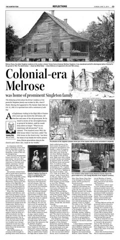 torical Sketches of Sumter County,” stated he was most likely interred at Cane Savannah Plantation). Enclosed in a wall of coquina rock, bordered with alternating pyramidal cypress and tall boxwoods, this quiet spot is the last resting place of many prominent South Carolinians, all members of the Singleton family. This is an interesting historic and beautiful spot which should surely be preserved. Perhaps Melrose and the old graveyard will be restored by the resettlement authorities, perhaps not; it remains to be seen. But, meantime, would it not be a good idea for Sumter County folk to interest themselves in preserving these landmarks by taking some steps toward having them spared? *Melrose, believed to be the oldest house in Sumter County, burned to the ground in June of 1962. The home, reportedly constructed by Matthew Singleton in 1753, was situated in the center of his Manchester estate. Reach Item Archivist Sammy Way at waysammy@theitem.
