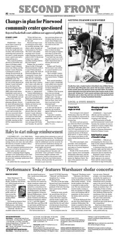 Rejected basketball court addition not approved publicly BY ROBERT J. BAKER bbaker@theitem.com PINEWOOD — Pinewood Town Council approved plans for a $400,000 community center for the small town last October, with architectural renderings that showed office space, a multi-purpose room, a porch area and a large parking area. New council members elected in November and Mayor Al Pridgen asked Sumter County Administrator Gary Mixon and the Sumter County Planning Commission in July to change the previously approved plans by replacing a large parking area with a basketball court. The planned community center, one of four planned for Sumter County and paid for on the back of the Penny for Progress sales tax passed by voters in 2008, will be built where basketball courts now sit near the town’s fire station. The basketball court addition to the center has since been thwarted by planning officials. However, some still question how the request for a basketball court got as far as it did. Councilwoman Frances Lester said recently that she was concerned about the new plans, because council members did not approve them in any open or public meeting as they did the original plans last year.