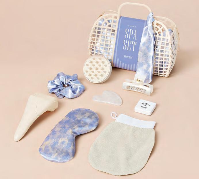 with Pinch Provisions’ Super Spa Set Carryall, packed with a full-size ice roller, silk sleep mask, gua sha, exfoliating mitt, hair clip, shower steamer, scarf massager and silk scrunchie. Pinchprovisions.com.