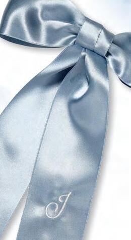 Bows are back — flowing down the back as veils, as details on dresses and in the hair on clips, like Jennifer Behr’s glossy April Satin Bow Barrette, personalized with your initial. Jenniferbehr.com.