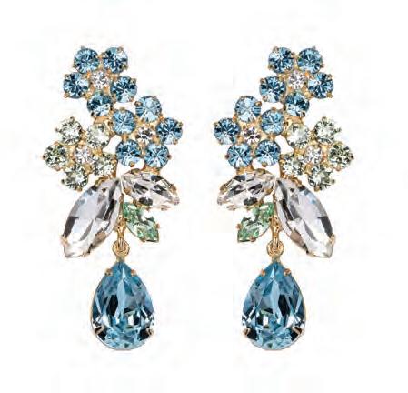Jennifer Behr’s aptly named crystal Bouquet Earrings (color: Bluebell) are wearable floral arrangements, ticking the trend boxes of color, statement jewels and a dose of irreverent glamour. Jenniferbehr.com.