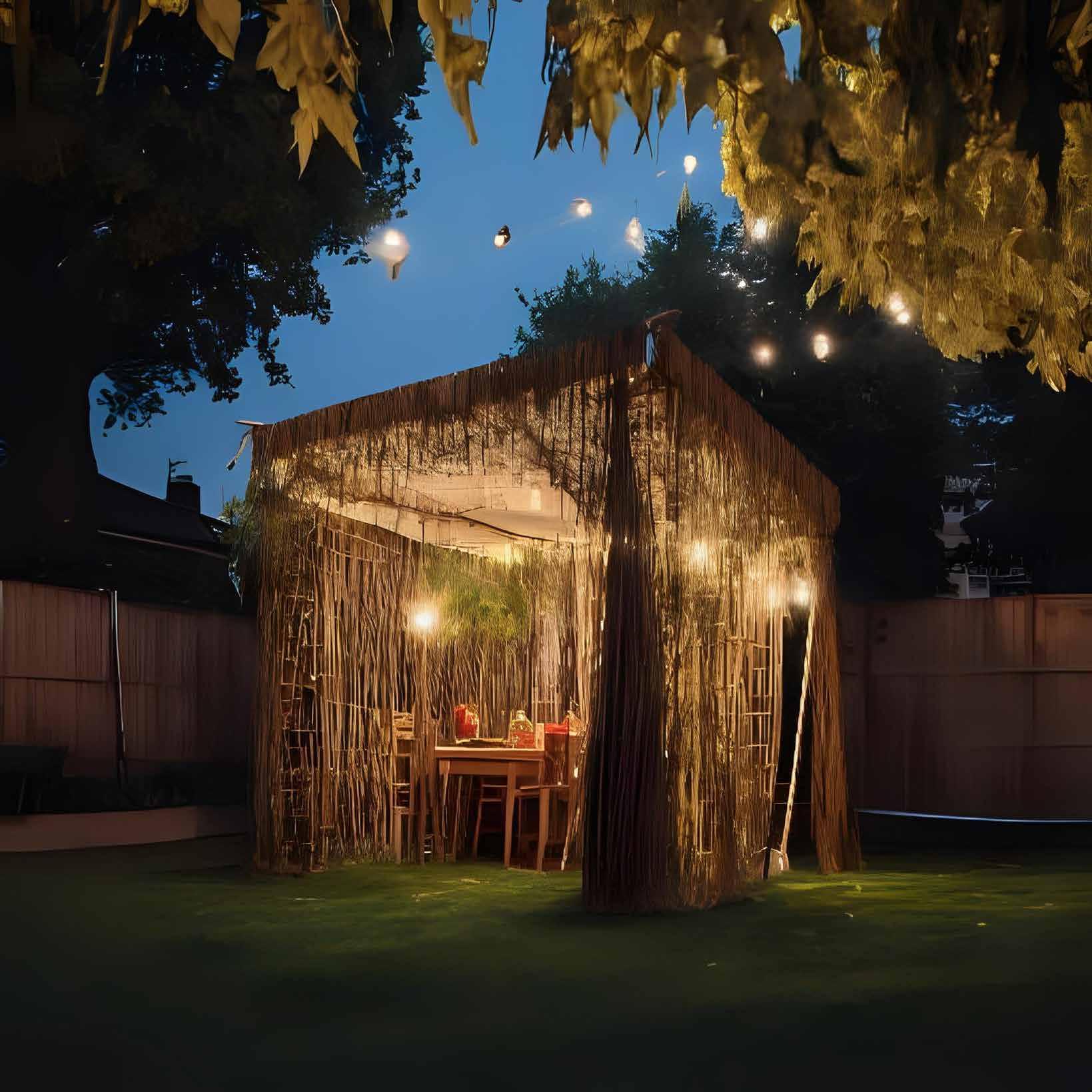 Te sukkah stands with branches light, A fragile home beneath the night.