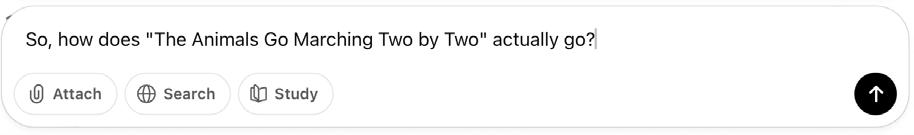 The animals go marching two by two, They all have jobs and things to do, And they all go marching on...