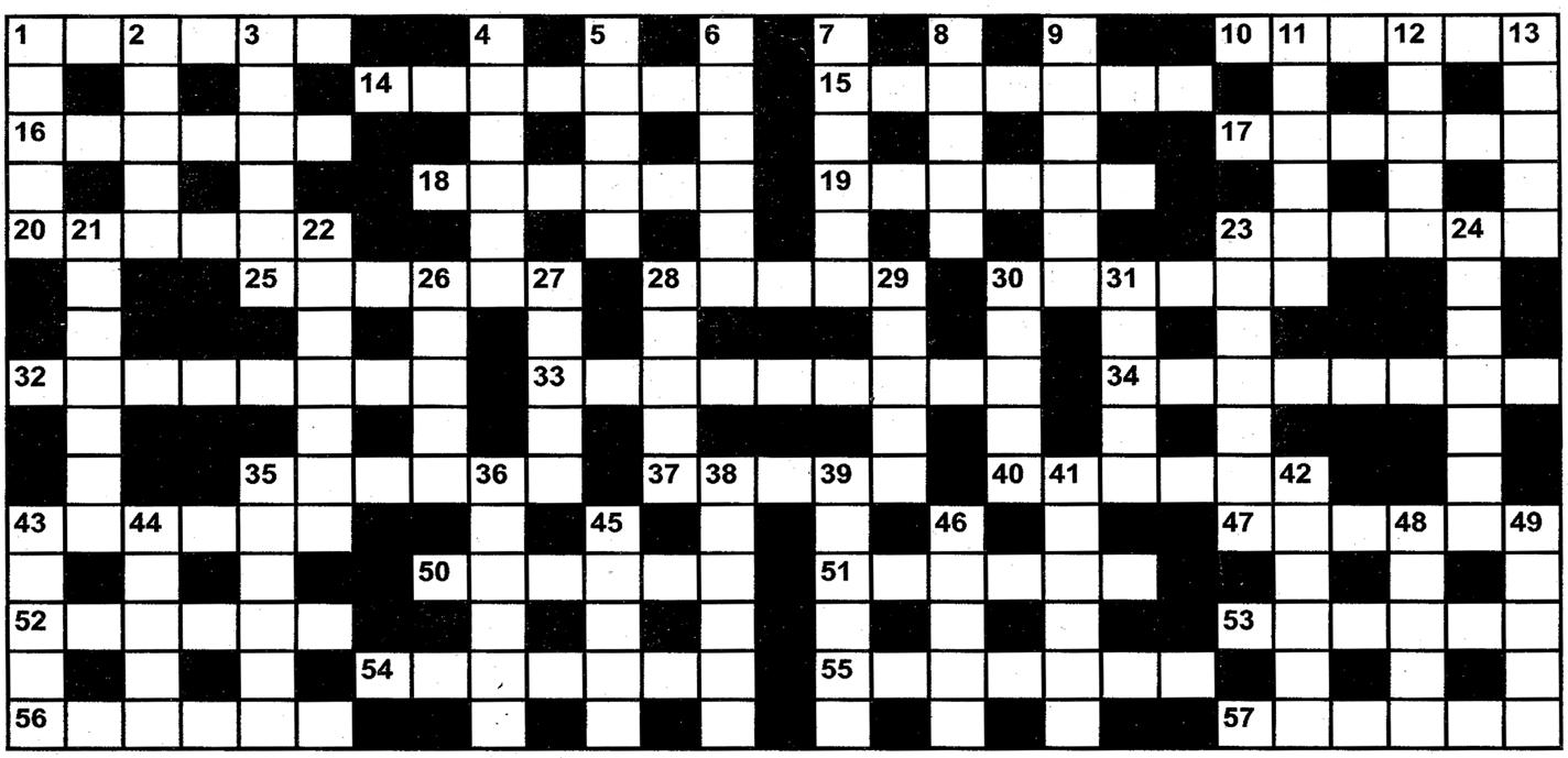 лей. 55. Наименьшее натуральное число. 56. «Орленок» с утренними линейками. 57. Северная птичка отряда воробьинообразных. ПО ВЕРТИКАЛИ: 1. Заменитель кваса в окрошке. 2. Любитель часто менять место работы. 3. Писательница Эмили, автор романа «Грозовой перевал». 4. Жесткий чехол для револьвера. 5. Человек, живущий на подаяние. 6. Опасный для рафтера участок реки. 7. Крупный австралийский попугай с хохолком. 8. Машина, нужная в страду. 9. Столица Хорватии. 11. Недопонимание в семье. 12. Диетические фрикадельки из мяса. 13. Недельное турне по кабакам. 21. Церковно-административная единица. 22. Породистый конь восточных кровей. 23. Намеренное или непроизвольное искажение черт лица. 24. Экзотическая «груша» в салате. 26. Рыболовная снасть-ловушка из прутьев. 27. Античная нимфа голубого ручейка. 28. Муж одной сестры для мужа другой. 29. Ложная, порочащая сплетня. 30. Первая в греческой азбуке. 31. Бревно, вставшее по стойке «смирно». 35. Кухонный создатель муссов. 36. Угол зрения живописца на предмет. 38. Минерал для фосфорных удобрений. 39. Королевич