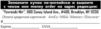 Отправьте чек на имя Yevreiski Mir по адресу: 1100 Coney Island Ave., #400, Brooklyn, NY 11230 или звоните по телефону: (718) 434-0900 и делайте пожертвования кредитной