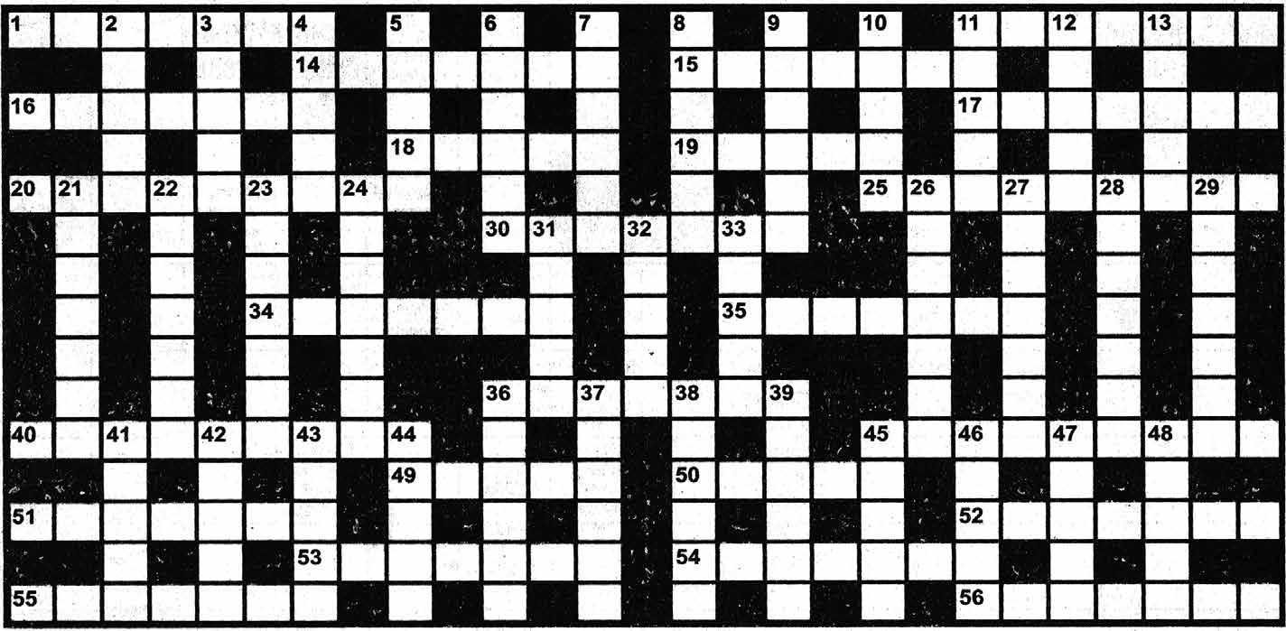 Подарок на английский лад. 16. Мифический напиток алхимиков, продлевающий жизнь и сохраняющий молодость. 17. «Настраивание» токарного станка. 18. Капустная «голова». 19. Между Венерой и Марсом в Солнечной системе. 20. Фольклорная народная мудрость. 25. Способ производства стандартных деталей. 30. Чем его больше «травят», тем дольше он живет. 34. Иллюстрированный перечень товаров. 35. Третьяковка как музей. 36. «Тарелка», закрепленная на крыше многоэтажки. 40. Фамилия, ставшая ироничным прозвищем доморощенных спецов по воспитанию детей. 45. Могущественный правитель в Индии. 49. Начинка гнилого пня. 50. Французская эстрадная певица, чья исполнительская манера сложилась под влиянием Эдит Пиаф. 51. Слово, близкое по значению, но отличное по звучанию. 52. Животный воск, широко применяющийся в медицине и косметике. 53. Первая буква имени или отчества. 54. Тип, не страдающий от худосочности. 55. Витринная кукла, разодетая по последней моде. 56. Состояние, в которое фантасты погружают своих героев при длительных перелетах. ПО ВЕРТИКАЛИ: 2. У древних греков река в подземном царстве мертвых. 3. Дорога, проложенная рекой. 4. Так звали иллюзиониста Гудини. 5. Морализующая философская дисциплина. 6. Единение города и деревни устами советского журналиста 20-х годов прошлого века. 7. Этой силой набираются, сидя за партой. 8. Небольшой отрывок киноленты. 9. Крупный муравей из тропиков. 10. Круглый пирожок с мясом. 11. Тканевая маскировка окна. 12. Неподвижный обитатель морского дна. 13. Алексей, сыгравший в фильмах «9 рота» и «Жара». 21. Повтор контуров тушью. 22. «Инвентарь» малыша, работающего в песочнице. 23. Лайма с хитом про Чарли. 24. Буйство красок в палисаднике. 26. Наследие Пифагора, мучащее школьников, изучающих геометрию. 27. Кроха по-простому. 28. Наряд конфеты. 29. Современный терем. 31. «Пушка» в кобуре чекиста. 32. Оружие Дон Кихота. 33. Маневр лихача. 36. Леонид, спевшийся с Анжеликой. 37. Охота с участием борзых. 38. Безмолвие Герасима. 39. Коллектив грузчиков. 41. День хлопот перед юбилеем. 42. Здесь можно поторговаться. 43. Стас, музыкант, композитор, по паспорту Микоян. 44. Сдача позиций океаном. 45. Кресло в зрительном зале. 46. Кузина вороны и грача. 47. Доход проценты с капитала. 48. Терпеливая жена Стивы Облонского.