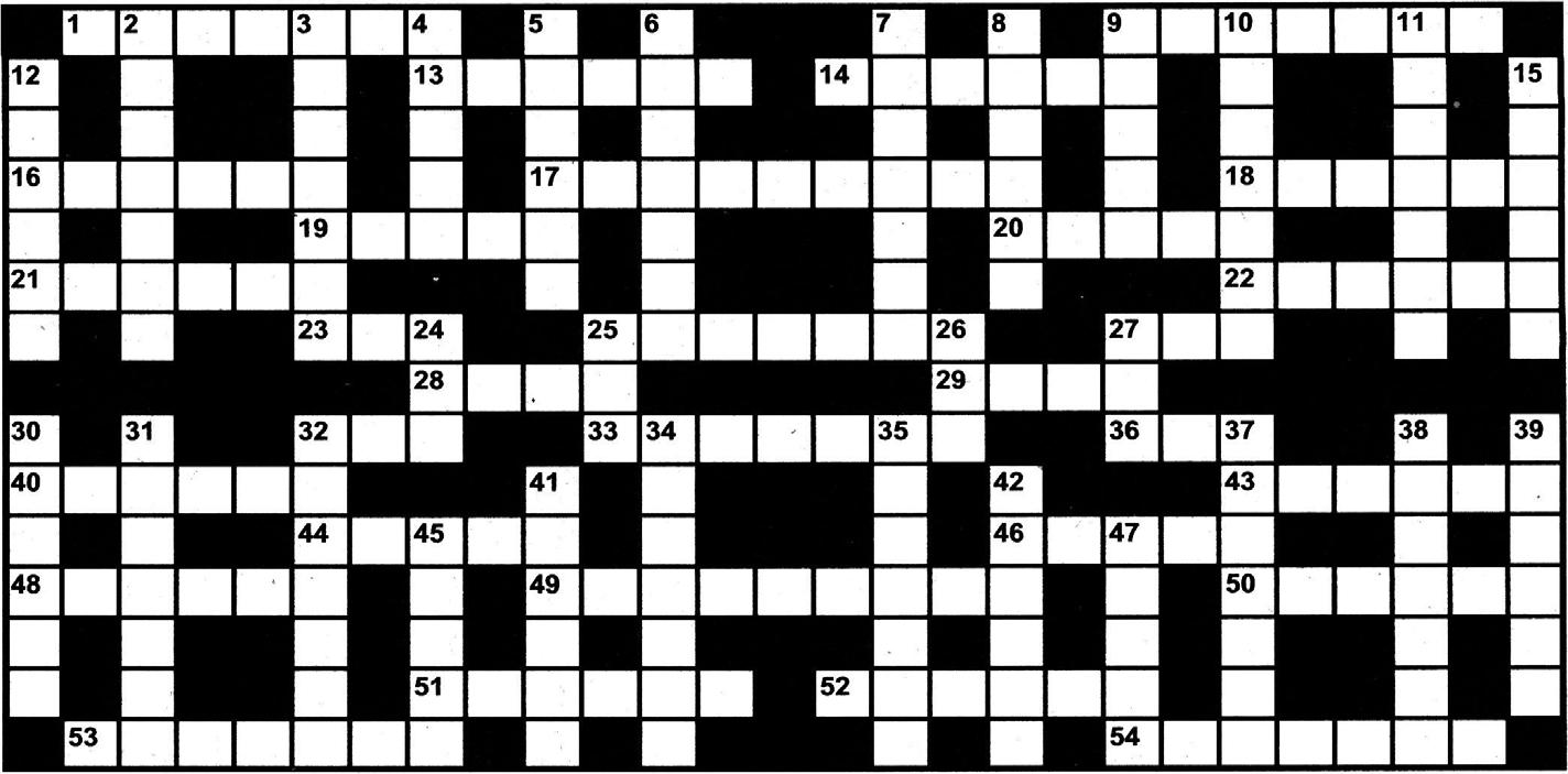 27. «Мир». 28. Анды. 29. Ария. 32. Дым. 33. Часовой. 36. Чуб. 40. Сверло. 43. «Ламбер». 44. Банан. 46. Токио. 48. Текила. 49. Квазимодо. 50. Нефрит. 51. -Нар вал. 52. Доллар. 53. Припасы. 54. Канадец. ПО ВЕРТИКАЛИ: 2. «Шевроле». 3. Изразец. 4. Аллюр. 5. Огурец. 6. Графика. 7. -Панте