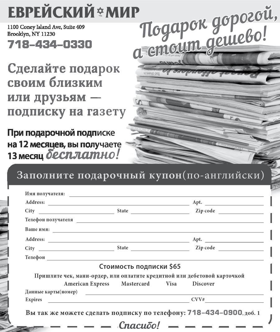 «Yevreiski Mir» 1100 Coney island Ave., #400, Brooklyn, NY 11230 Редакция оставляет за собой право отказать в публикации и редактировать любое объявление и авторский