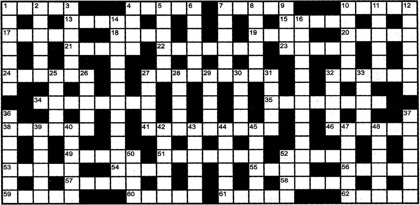 ПО ГОРИЗОНТАЛИ: 1. Амплуа актера, умеющего рассмешить. 4. Писатель, поведавший о Чингачгуке. 7. Овевание со всех сторон. 10. "Чистый" размер заработной платы. 13. Границы приличия. 15. Том, звезда фильма "Форрест Гамп". 17. "Перья" в хвосте фрака. 18. Грозный среди русских царей. 19. Щербинка на чашке. 20. Башня в углу шахматной доски. 21. Любовный романчик неодобрительно. 22. Уроженка Грозного. 23. Щеголь на улочке Лондона. 24. Этим напитком был измучен монтер Мечников из "Двенадцати стульев". 27. Сторонник чрезмерно рискованных видов спорта. 32. Писатель ... Хармс. 34. Оружейник из сказки Ю. Олеши "Три толстяка". 35. Скупость скряги. 38. Кличка собачки Карандаша. 41. Остров, якобы ушедший под воды океана. 46. Опасная часть иглы. 49. Гриб-"шатен". 51. Пудель рядом с Мальвиной. 52. Изящный платок на шее, куда можно спрятать нос. 53. Место встречи Волги и Каспия. 54. "Единица информации" сарафанного радио. 55. Сын дяди Степы у С. Михалкова. 56. Горный район с нетрадиционной медициной. 57. Сериал "Бедная ...". 58. Королева в названии романа А. Дюма. 59. Возможность общения между абонентами сотовой сети. 60. Женщина с веретеном. 61. Юбка, прячущая щиколотки. 62. Кровать для пациента клиники. ПО ВЕРТИКАЛИ: 1. Ресторанчик, где подают эспрессо. 2. Артур - американский драматург, автор прославленной пьесы «Смерть коммивояжёра». 3. "Головной убор" банки. 4. Новозеландская птица, не умеющая летать. 5. Коротышка, приятель Сиропчика, из сказки Н. Носова «Незнайка на Луне». 6. Воинская группа при орудии. 7. Особенность вологодского говора. 8. "Послевкусие" огорчения. 9. Место для проникновения в помещение. 10. Мама лошака. 11. "Инструмент" для оваций. 12. Некто, проявивший себя на определенном поприще. 14. Создатель сюжетной линии экранного шедевра. 16. Струнный музыкальный инструмент, "подсоединенный к розетке". 25. Обещание самому себе. 26. Пустынное плато на южном побережье Перу, на котором обнаружены гигантские геометрические фигуры. 27. Крупный период истории. 28. Стивен, голливудский мастер айкидо. 29. И мужское имя, и сочинение прозаика. 30. "Спасибо" по-французски. 31. Она дорога к обеду. 32. Танцевальные мелодии 80-х. 33. Поклеп на того, кто ничего не совершал. 36. Отвлечение от основной темы. 37. Создание газетных полос. 39. Республика Саха по-другому. 40. Красиво цветущий кустарник. 42. Часть дыхательных путей. 43. Магазин пилюль и микстур. 44. Африканский барабан. 45. Бывшая Юзовка на современных картах. 47. Небольшая озерная рыбка. 48. Вооруженное нападение преступников. 50. Затычка в арсенале преступника. 52. Республика зырян.