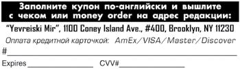 или звоните по телефону: (718) 434-0900 и делайте пожертвования кредитной или дебетовой карточкой. Желающие сделать пожертвования по PayPal могут зайти на наш веб-сайт evreimir.com и нажать кнопку «Помощь сайту» справа вверху. Имена всех поддержавших газету и веб-сайт будут опубликованы. На такого рода публикацию мы можем предоставить инвойс (по требованию) для списания налогов. Перед нами стоит задача развития газеты и ее интернет-сайта, привлечения новых авторов, способных донести ценности еврейского мира. Это требует средств. Мы предлагаем вам сделать шаг в будущее вместе с нами. Пожалуйста, станьте спонсором газеты! Поддержите нашу газету! www.evreimir.com RUSSIAN JEWISH WEEKLY YEVREISKI MIR (ISSN 1067-3431) (USPS 009-412) is published weekly by X-Press Publications at 1100 Coney Island Ave. #400 Brooklyn, NY 11230 Tel. (718) 434-0900 Fax (718)434-7077 e-mail для материалов/editorial: yevmir@gmail.com для рекламы/advertisement: emadv1@gmail.com Aryeh Katzin Editor-in-Chief Liliya Kossovskaya Editor Mina Geltman Web-master Polina Chuzhina Advertising Katerina Bochkarova Designer Periodical Postage paid at Brooklyn, NY Postmaster: send address changes to «Yevreiski Mir» 1100 Coney island Ave., #400, Brooklyn, NY 11230 Редакция оставляет за собой право отказать в публикации и редактировать любое объявление и авторский материал. За содержание объявлений редакция ответственности не несет. Материалы со знаком [Р] печатаются на коммерческой основе.