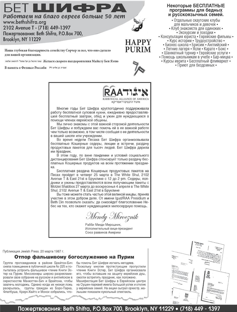 газеты и ее интернет-сайта, привлечения новых авторов, способных донести ценности еврейского мира. Это требует средств. Мы предлагаем вам сделать шаг в будущее вместе с нами. Пожалуйста, станьте спонсором газеты! Поддержите нашу газету! www.evreimir.com RUSSIAN JEWISH WEEKLY YEVREISKI MIR (ISSN 1067-3431) (USPS 009-412) is published weekly by X-Press Publications at 1100 Coney Island Ave. #400 Brooklyn, NY 11230 Tel. (718) 434-0900 Fax (718)434-7077 e-mail для материалов/editorial: yevmir@gmail.com для рекламы/advertisement: emadv1@gmail.com Aryeh Katzin Editor-in-Chief Liliya Kossovskaya Editor Mina Geltman Web-master Polina Chuzhina Advertising Katerina Bochkarova Designer Periodical Postage paid at Brooklyn, NY Postmaster: send address changes to «Yevreiski Mir» 1100 Coney island Ave., #400, Brooklyn, NY 11230 Редакция оставляет за собой право отказать в публикации и редактировать любое объявление и авторский материал. За содержание объявлений редакция ответственности не несет. Материалы со знаком [Р] печатаются на коммерческой основе.