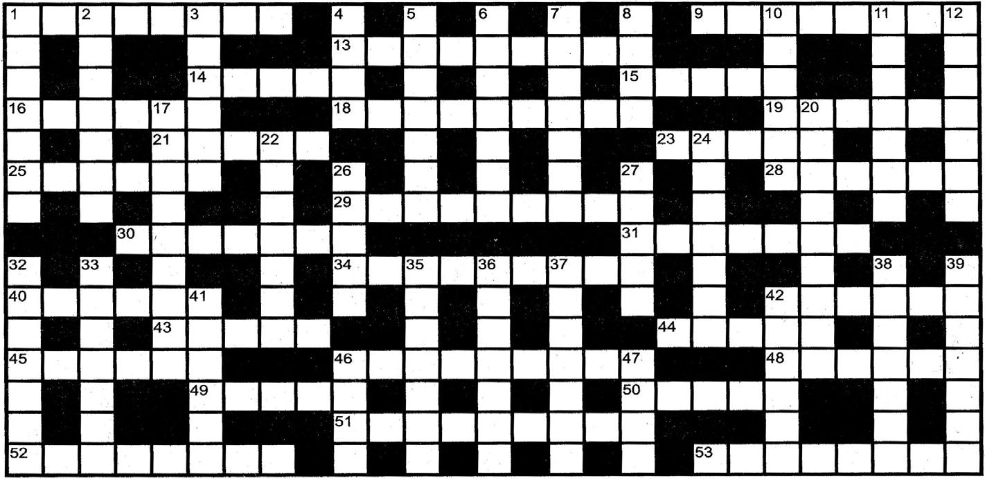 Государство в Восточной Африке со столицей Мапуту. 13. Согласно пословице, его три года ждут. 14. Знаменитый французский скульптор. 15. Вещица из мужского белья. 16. Неспешный разговор за чашечкой чая. 18. Раздел математики, изучаемый в школе. 19. Ведущий свадебного застолья, не дающий гостям заскучать. 21. Претензия на оригинальность. 23. «Мелодия» подкованных копыт. 25. Бесприданница Огудалова в пьесе драматурга А. Островского. 28. Донос или жалоба по-простому. 29. Предмет кухонной мебели. 30. Сознание словно в тумане. 31. Населенный пункт с бревенчатыми избами. 34. Поверхность, что слегка под наклоном. 40. Федор - русский поэт-лирик. 42. Жилище индейца. 43. «Скоростемер» в руке дорожного инспектора. 44. «Лицо» здания. 45. Слово, что звучит так же, а обозначает совсем другое. 46. Педагог, занимающийся дополнительно. 48. Присмотр за фирмой со стороны пожарных. 49. Давно не чесанные, неаккуратные пряди волос. 50. Камни, «съехавшие» вниз. 51. Общественный строй эпохи Советского Союза. 52. «Гибрид» копья с секирой среди старинного оружия. 53. Специалист, раскладывающий ситуацию «по полочкам». ПО ВЕРТИКАЛИ: 1. Навар, полученный от удачной сделки. 2. Элемент подвески легковушки. 3. Болезнетворное начало, распространяемое микробами. 4. Ударный музыкальный инструмент азиатского происхождения. 5. Инвентарь альпиниста, покоряющего вершину. 6. Повар в артели. 7. Театральный перерыв «на бутерброд». 8. Зернышко, брошенное в почву. 10. Человек, сведущий в своей области. 11. Вздорный болтун, вносящий беспорядок, раздор. 12. Выпечка «вот такой вышины» на именины. 17. Спутниковый и кабельный телеканал США, посвященный науке, технологии и истории. 20. Якобы затонувший остров-государство, известный по преданиям. 22. Декартово «содружество» координат. 24. Фантик по отношению к конфетке. 26. Имя самого рослого милиционера. 27. Деревянное ведро. 32. Место, где можно встретить бригадиров и прорабов. 33. Знак, информирующий о пропуске в тексте. 35. Мельчайшая частица чего-либо. 36. Поклонник сценического искусства, посещающий премьеры и бенефисы. 37. Прибор для выяснения количества затраченной электрической энергии. 38. Военнослужащий, ответственный за «проводное» общение. 39. Скукоженный съедобный гриб. 41. Дракула как кровопийца. 42. Автор письма «на деревню дедушке». 46. Хищная кошка с кисточками на ушках. 47. Футбольный клуб столицы Италии.