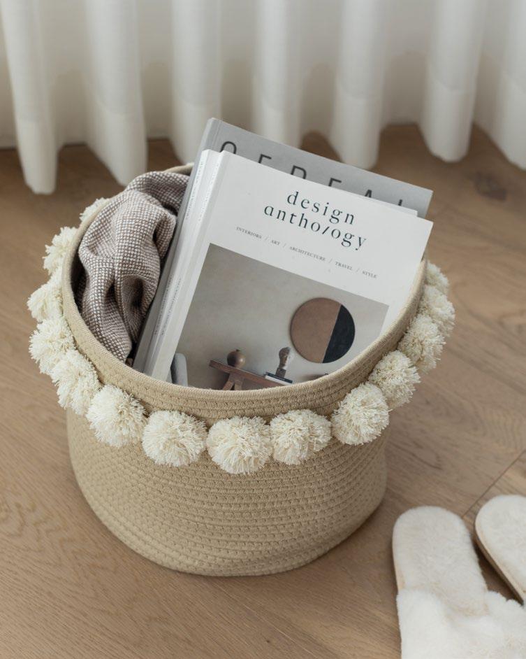 This custom pom pom basket makes storing blankets and pillows chic! It beautifully complements the previous Twig and Tassel basket featured in The Winter 2021 Jilly Box, this one with a gorgeous taupe hue. We kept our first Twig and Tassel basket in Annie’s room, but they look so fantastic in the living room that now we have them out, styled on the shelves next to our fireplace. Whether you live in a large or small space, these are great for tidying up the look of your living space in style!