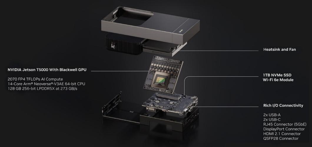 Jetson Thor's powerful 14-core Arm Neoverse-V3AE CPU and innovative Blackwell Multi-Instance GPU (MIG) technology enable you speed up low-latency, real-time applications. A third-generation Programmable Vision Accelerator (PVA), two encoders and decoders, an optical flow accelerator, and other accelerators are also included. The developer kit provides a wide range of I/O options for high-speed sensor fusion, such as a wired Multi-GbE RJ45 connector, several USB ports, a QSFP slot with 4x25GbE, and various connectivity interfaces. Additionally, it is built to integrate seamlessly with current humanoid robot platforms, making tethering simple and enabling rapid prototyping.