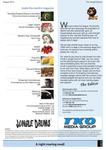 Disclaimer The Jungle Drums, its publishers, members of staff and its agents do not accept responsibility for claims by advertisers nor can it be held responsible for any errors in advertisements which are reproduced from poor artwork, low quality electronic data or inadequate instructions for text or other layout features. Further no responsibility is accepted for any loss or damage caused by an error, inaccuracy or non-appearance of any advertisement, although all advertisements produced are checked prior to insertion. We regret that we cannot accept responsibility for more than ONE incorrect insertion and that no re-publication will be granted in the case of typographical or minor changes which do not affect the value of the advertisement. E&OE NO PART OF THIS MAGAZINE MAY BE REPRODUCED WITHOUT THE WRITTEN CONSENT OF THE PUBLISHERS. Published by TKO Media & Entertainment S.L.U, CIF: B53825998