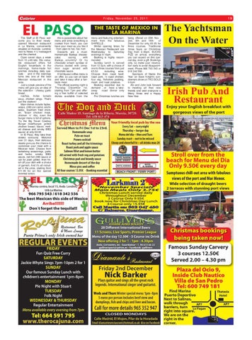 THE TASTE OF MEXICO IN LA MARINA menu and featuring entertainment from the fabulous SHIRELLE . Winter opening times for the Mexican Restaurant are Wednesday to Saturday evenings 6-10pm. Booking is highly recommended. Sunday lunch is served from 12-3pm, with a choice of one to three courses from just €5.50 including wine. Choose from roast beef, roast pork, ½ roast chicken, four veg, Yorkshire pudding, mash and roast potatoes. Booking essential due to demand ...or ..have a takeaway roast dinner only €4.95. Pre Christmas lunches are