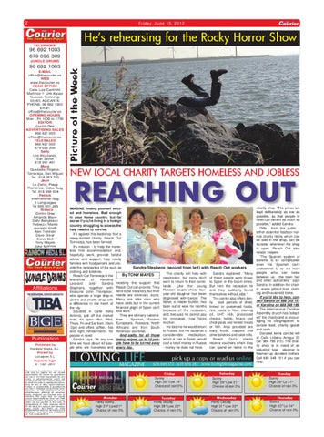 charity shop. “The prices are IMAGINE finding yourself evictkept deliberately as low as ed and homeless. Bad enough possible, so that people in in your home country, but far need can benefit as much as worse if you're living in a foreign possible," added Sandra. country struggling to access the Gifts from the public help needed to survive. either essential foods or norIt's against this backdrop that a mal charity items which can newly-formed charity, Reach Out be sold in the shop, can be Torrevieja, has been formed. donated whenever the shop It's mission - to help the homeis open. Reach Out also less find accommodation and, needs helpers. hopefully, work, provide helpful "The Spanish system of advice and support; help needy benefits is so complicated families with food parcels and proeven the Spanish can't vide the necessities of life such as Sandra Stephens (second from left) with Reach Out workers understand it, so we want clothing and toiletries. people who can liaise The charity will help with Sandra explained: "Many By TONY MAYES Reach Out Torrevieja is the repatriation, but many don't of these people were drawn between us , the town hall brainchild of Karolina want to return to their home- to Spain in the boom times. and other authorities,’’ says Leonard and Sandra needing the support that lands .Like the young But then the recession hit Sandra. In addition the chariStephens, together with Reach Out can provide. They Russian couple whose four- and they suddenly found ty wants gifts of food, clothtreasurer John Thompson, tend to be transitory, but their ing and household items. who operate a large drop-in needs are obviously acute. year-old daughter has been themselves without jobs." If you'd like to help, conThe centre also offers famcentre and charity shop with Many are able men who diagnosed with cancer. The tact Sandra on 688 348 151 father, a master builder, has ily food parcels of dried, a difference in the heart of have skills but in the current or Karolina on 688 348 189. financial plight of Spain can't been out of work for months tinned or preserved foods, the city. The International Christian because of the recession, rice, pasta or flour, cooking Situated in Calle Bella find work." Assembly church has "adoptand, because he cannot pay oil, UHT milk, processed They are of many nationalAntonia, just off the market ed" the charity and is encourroad, it’s open Mon, Wed, ities - Spanish, Eastern his mortgage, now faces cheese, lentils, beans and aging its congregation to eviction. chick peas and tinned meats Thurs, Fri and Sat from 10am Europeans, Russians, North He told me he would return or fish. Also provided are donate food, charity goods -2pm and offers coffee, tea Africans and from South to Russia, but his daughter’s baby foods, nappies and and cash. and light refreshments for American countries. Donated items can be left medication, other toiletries and toilet rolls. And sadly, for all those considerable people in need. at Calle Urbano Arregui 23 Reach Out‘s clients Sandra says: "At any one being helped, up to 10 peo- which is free in Spain, would (tel: 966 799 273). The chartime we have about 40 peo- ple have to be turned away cost a lot of money in Russia receive vouchers which they ity shop is in need of an can spend on items in the - money he does not have. ple who are homeless and every day. industrial type steamer to freshen up donated clothes. Call 688 348 151 if you can help. Friday Sunny High 28° Low 19° Chance of rain 0% Monday Partly sunny High 29° Low 21° Chance of rain 0%