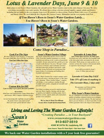 Lotus & Lavender Days, June 9 & 10 Make plans to visit Swan’s Water Gardens, the only full service Water Garden center in the entire Kansas City area. We carry everything you need for your water garden. We always have a large selection of pond supplies, aquatic plants and flowers, including but not limited to the ever popular Lotus (over 20 varieties to choose from), Tropical Water Lilies (over 15 varieties) and Hardy Lilies. We stock Butterfly Koi, Regular Koi, Sarasa Comets, Shubunkins and the ever popular Gold Fish.