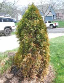 Arborvitae shows symptoms of winter desiccation.