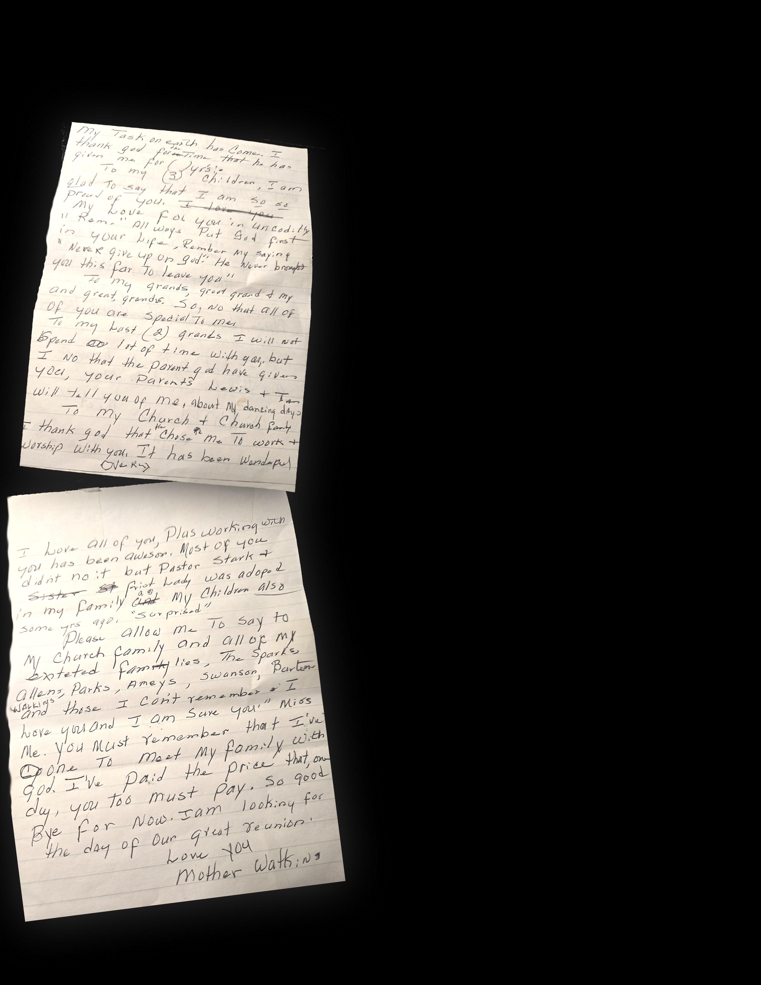 In her later years even as she faced health challenges and her culinary skills slowed down, Gee continued this gift called life with joy and laughter. Although not as mobile as she had been in previous years and sometimes unable to attend various functions, Mother Watkins would mail a card, write a letter enclosed with a token of love or leave a voicemail in times of rejoicing or times of mourning. She could be heard saying “Don’t give up on God ‘cause He’s not through yet!”