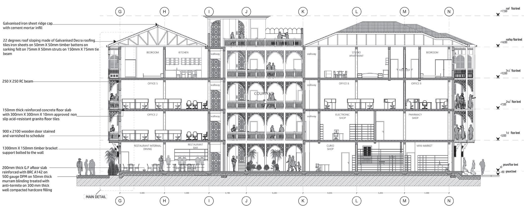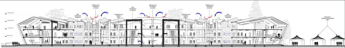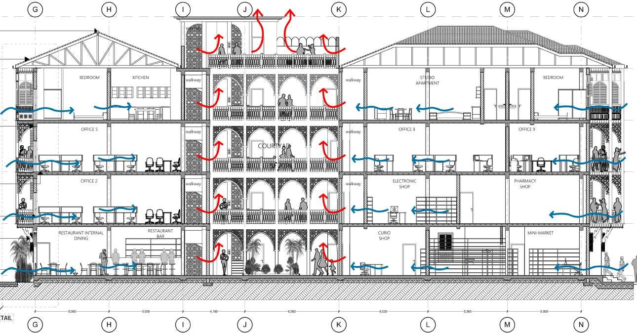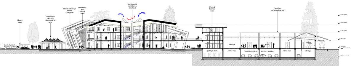 Circulation layout is inspired by alleyways of historical Swahili villages which took advantage of sea breeze to cool homes and spaces in between. The plan layout of the public market respond to the site’s wind directions, existing movement patterns, and space’s program and zoning.
