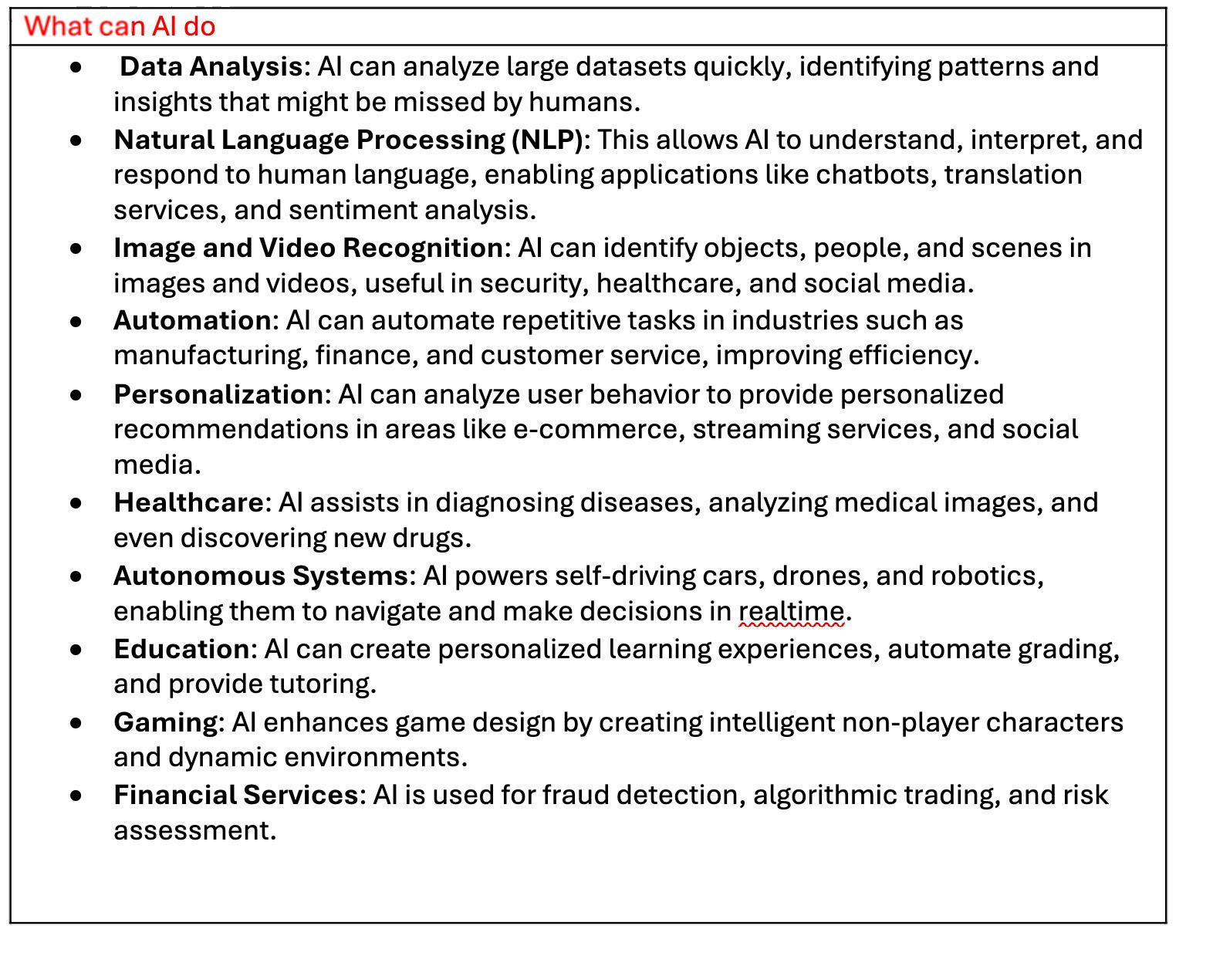 Personalization: AI can analyze user behavior to provide personalized recommendations in areas like e-commerce, streaming services, and social media.