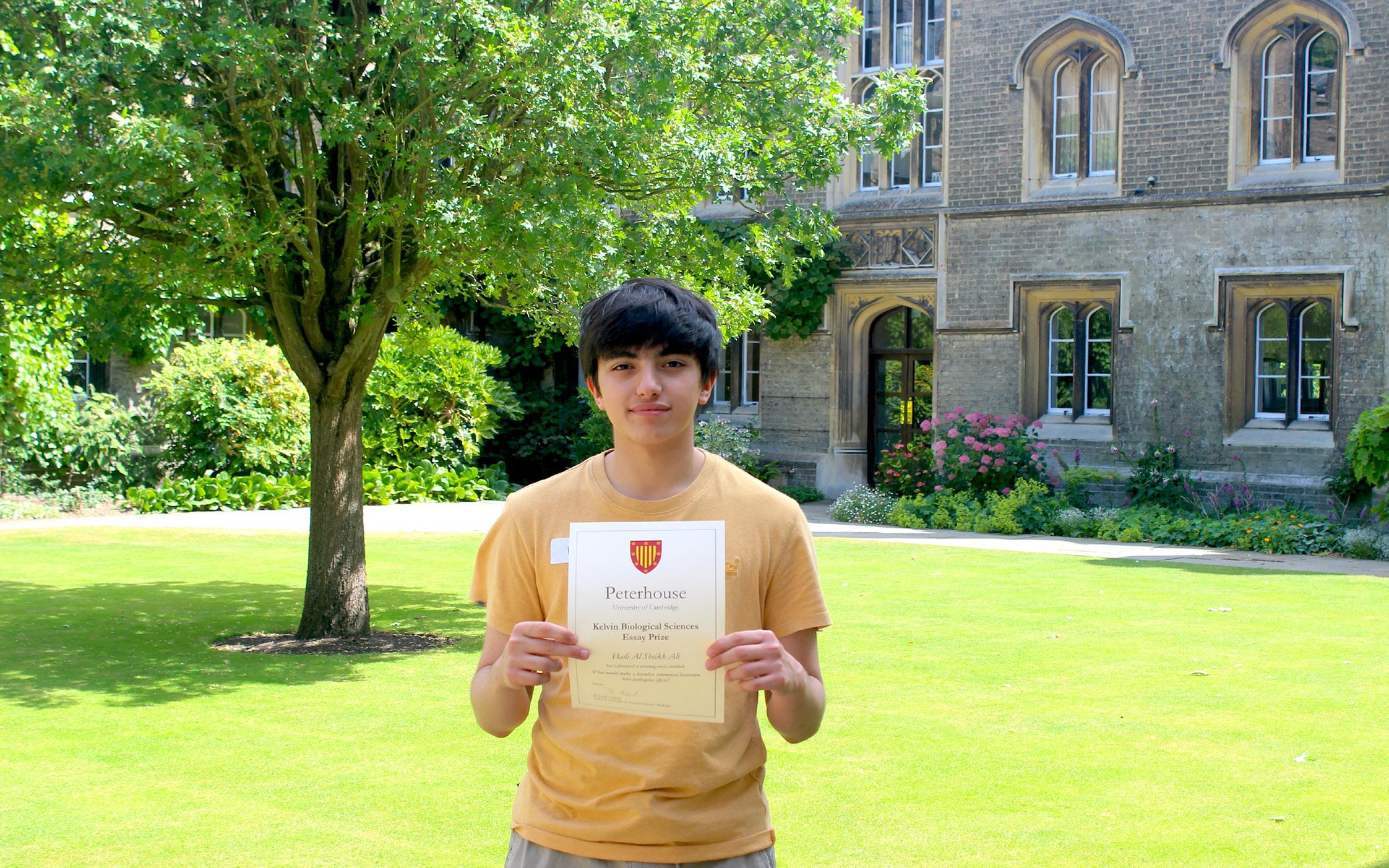 Hadi Alsheikh-Ali entered the Peterhouse Kelvin Biological Sciences Essay Competition and was delighted to be informed that he had written a winning essay. He was told that the standard of entries was extremely high, but the judge felt that his essay stood out. Hadi was awarded a prize of £125, and to invited to a special celebration event at Peterhouse, Cambridge this term.