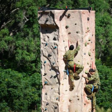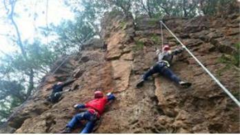 - RockClimbing (6J)boys work together to belay each other and provide guidance when trying to climb the wall