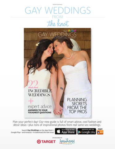 Plan your perfect day! Our new guide is full of smart advice, cool fashion and décor ideas—plus tons of inspirational photos from real same-sex weddings. Search Gay Weddings on the App StoreSM , Google PlaySM and AmazonSM to download the new issue. sponsored by