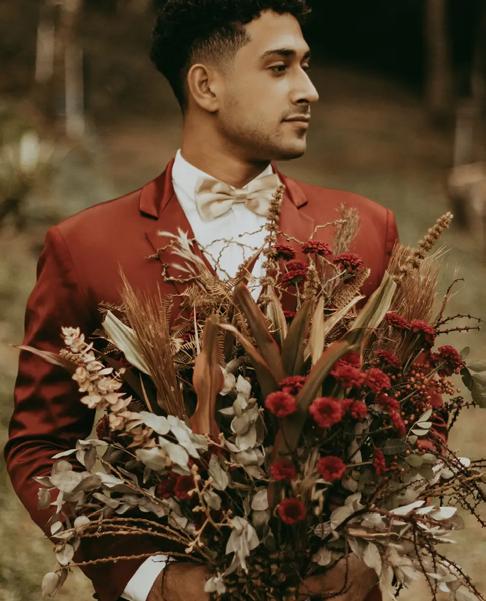 As novas gerações, felizmente, já entenderam que as separações de gênero como algo obrigatório fi cam no passado e, assim como a sociedade atual, os casamentos também abraçam essa liberdade. Sendo assim, é possível ver acessórios típicos de noivas – que, até então, foram tidos como femini nos – tornando-se parte do look do noivo. Eles, inclusive, passam a ser mais protagonistas, seja em casamentos heteroafetivos ou homoafetivos. O que vale é mostrar a personalidade do casal, e um buquê para o noivo é encantador!